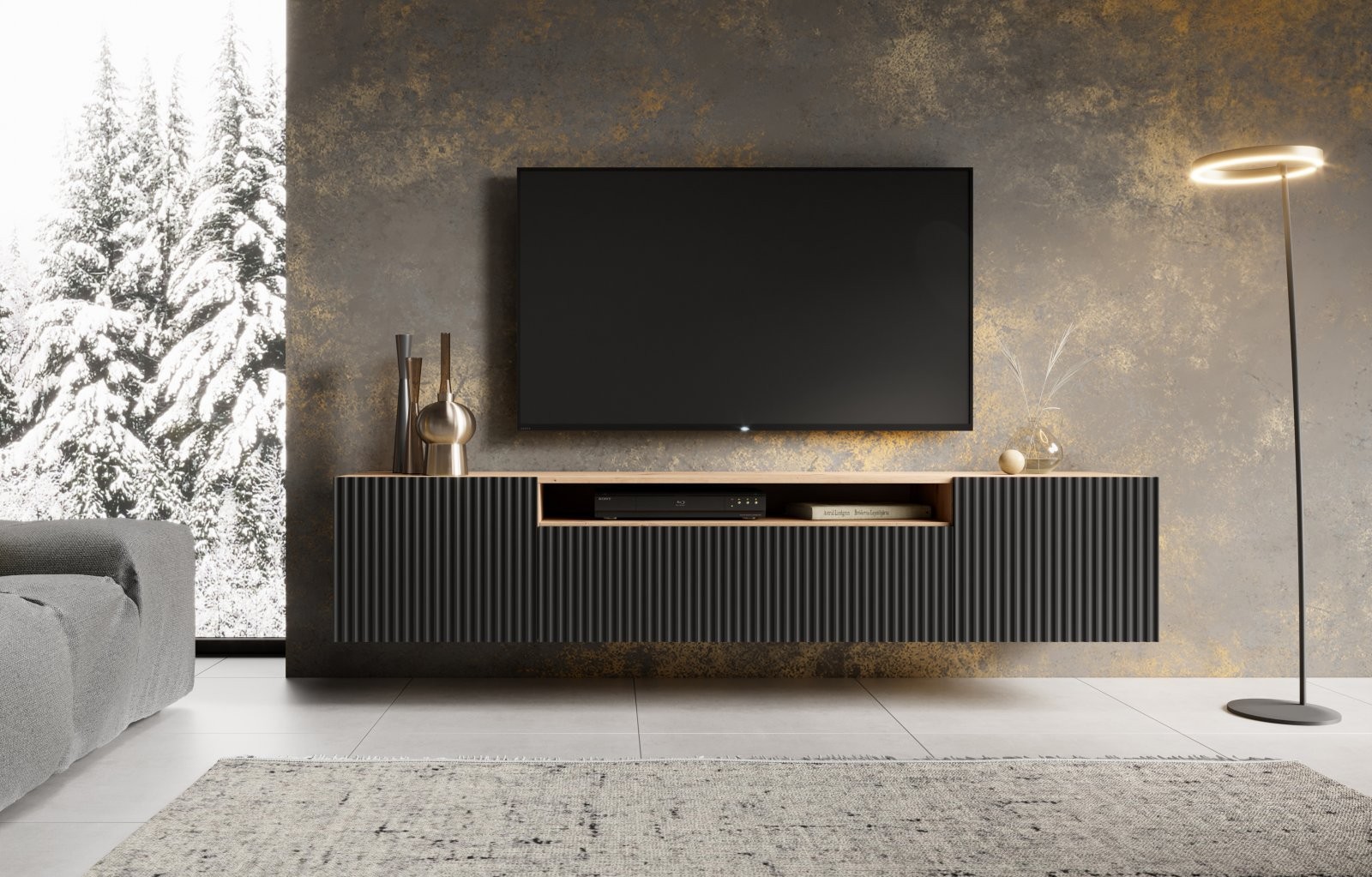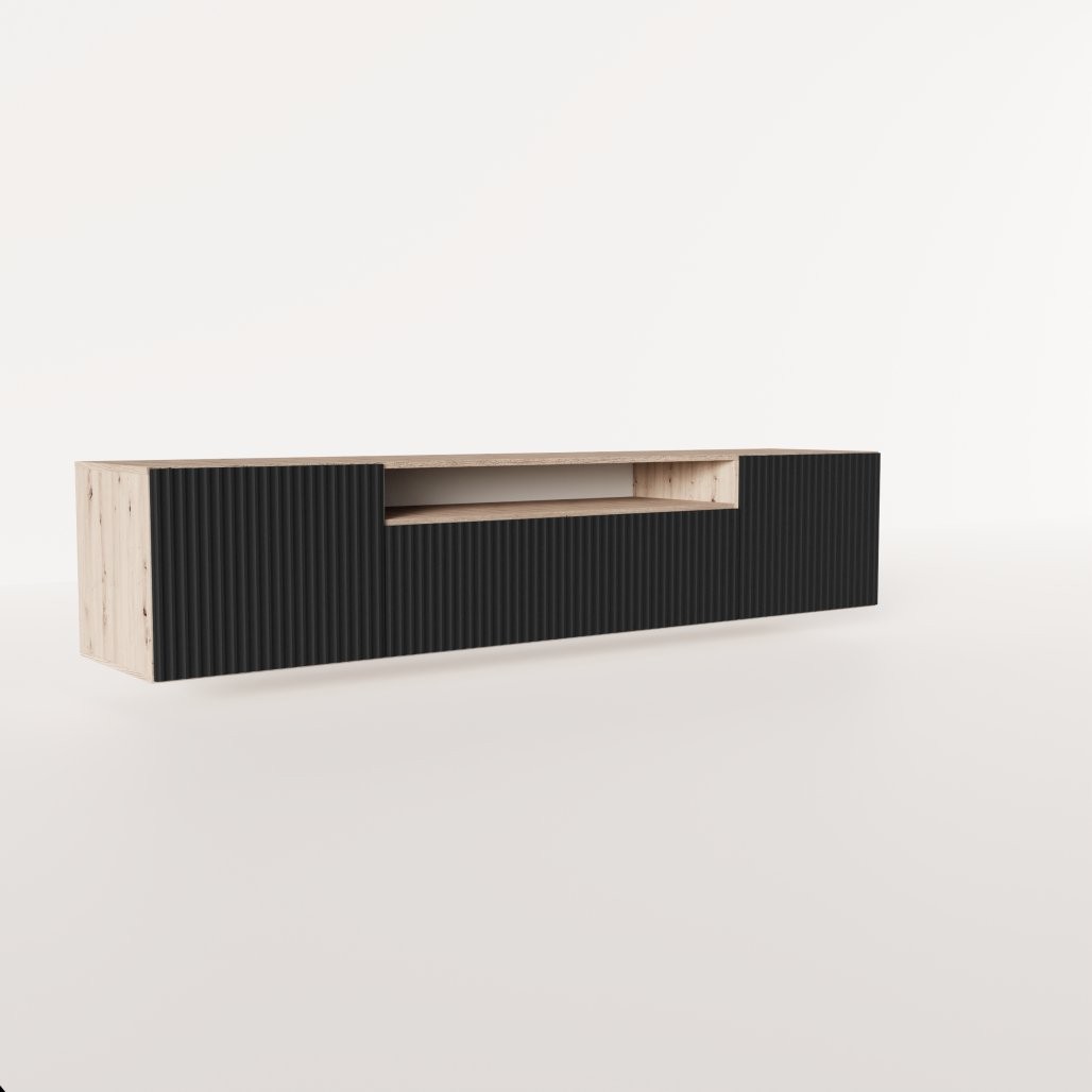 Viseča TV omarica NOEMI je sodobna in elegantna rešitev za vaš dnevni prostor. Zasnovana je za funkcionalno shranjevanje elektronskih naprav in dodatkov, hkrati pa s svojim žlebljenim zaključkom doda prostoru poseben estetski pečat.