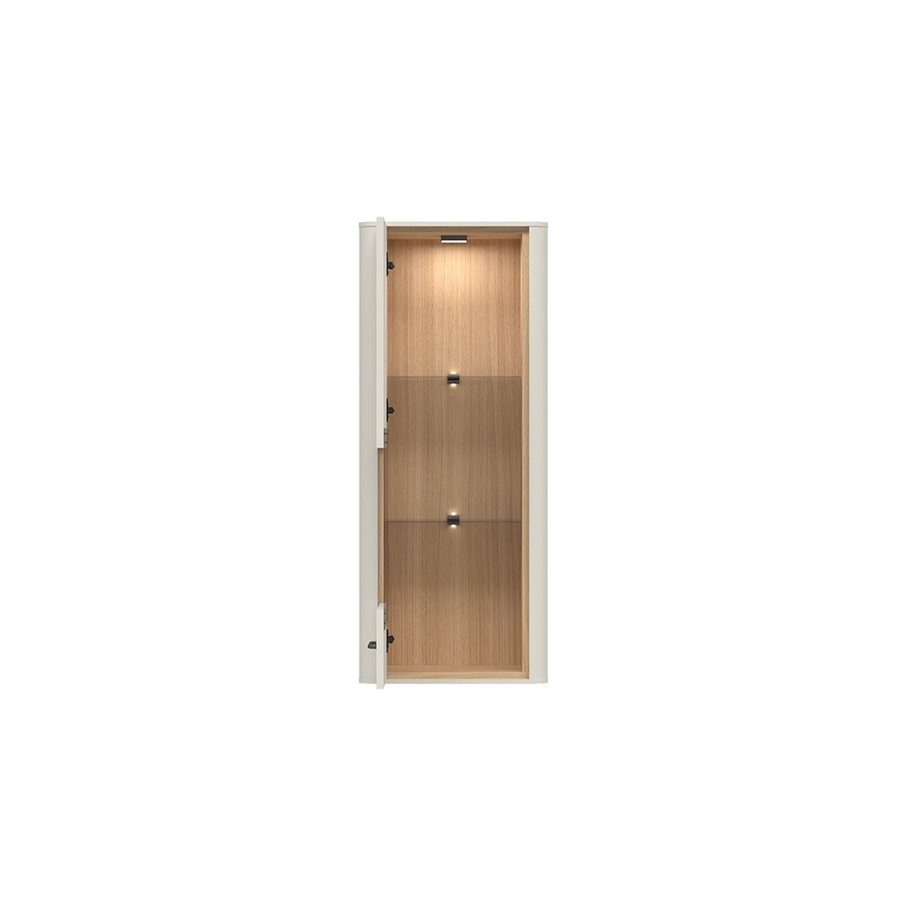 Viseča vitrina RADDA AIR s steklenimi vratci omogoča diskreten pogled v notranjost vitrine, steklene police in LED osvetlitev pa še dodatno izpopolnijo videz vitrine. Vključuje mehanizem mehkega zapiranja, ki omogoča enostavno vsakodnevno uporabo.