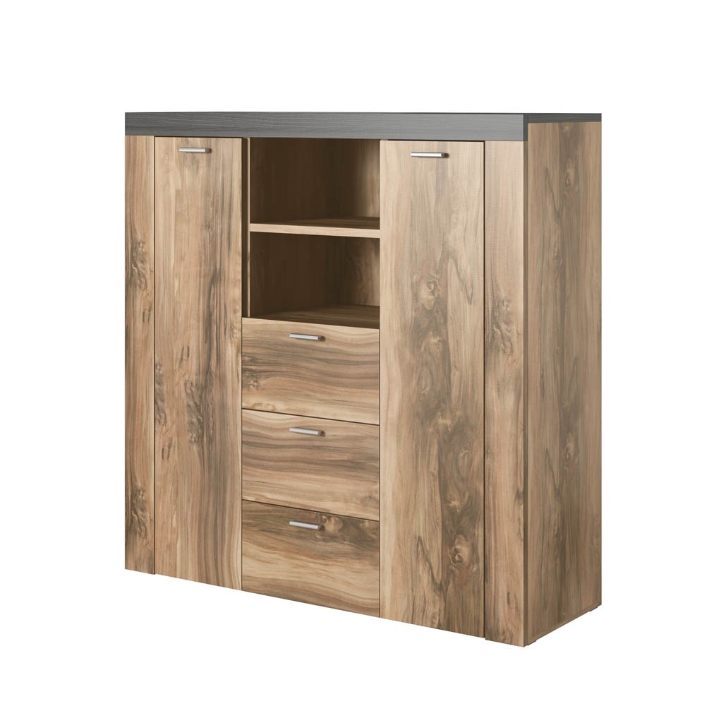 Dodajte svoji dnevni sobi ali jedilnici dragoceni dodatni prostor za shranjevanje z visoko komodo ERIKA. Komoda ima kar tri predale in dvojna vratca s skupno 6-imi policami, zato vam nudi obilo prostora za shranjevanje revij, družabnih iger in ostalih poljubnih predmetov. Ima tudi dve odprti polički na kateri lahko odložite razne knjige, slike in dekoracije. Na voljo je tudi v drugih barvah!
