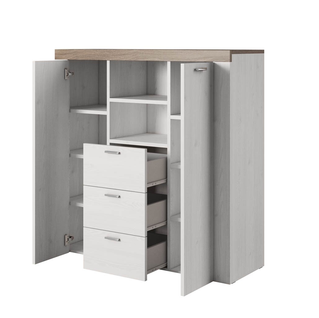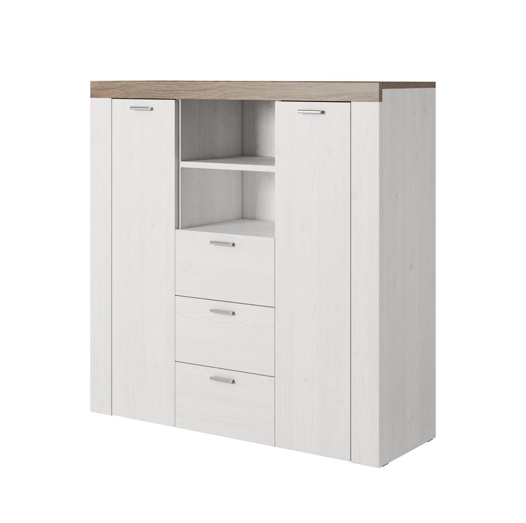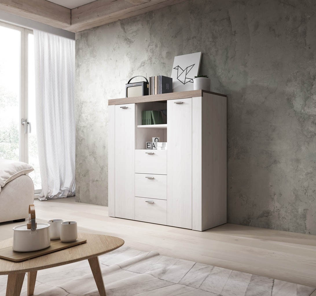 Dodajte svoji dnevni sobi ali jedilnici dragoceni dodatni prostor za shranjevanje z visoko komodo ERIKA. Komoda ima kar tri predale in dvojna vratca s skupno 6-imi policami, zato vam nudi obilo prostora za shranjevanje revij, družabnih iger in ostalih poljubnih predmetov. Ima tudi dve odprti polički na kateri lahko odložite razne knjige, slike in dekoracije. Na voljo je tudi v drugih barvah!