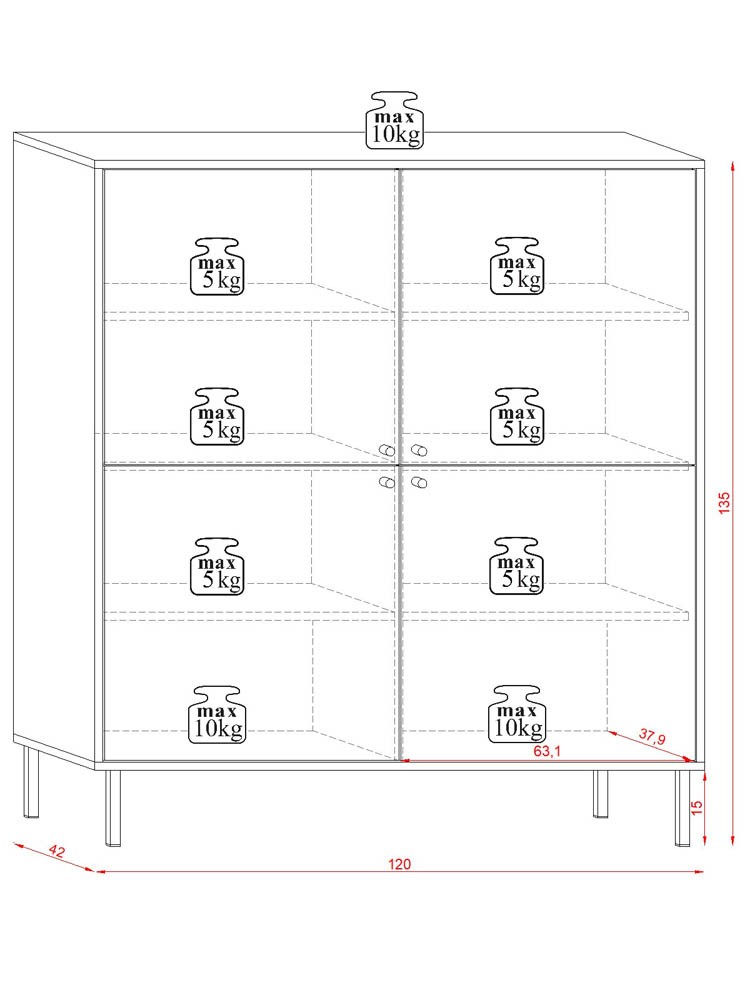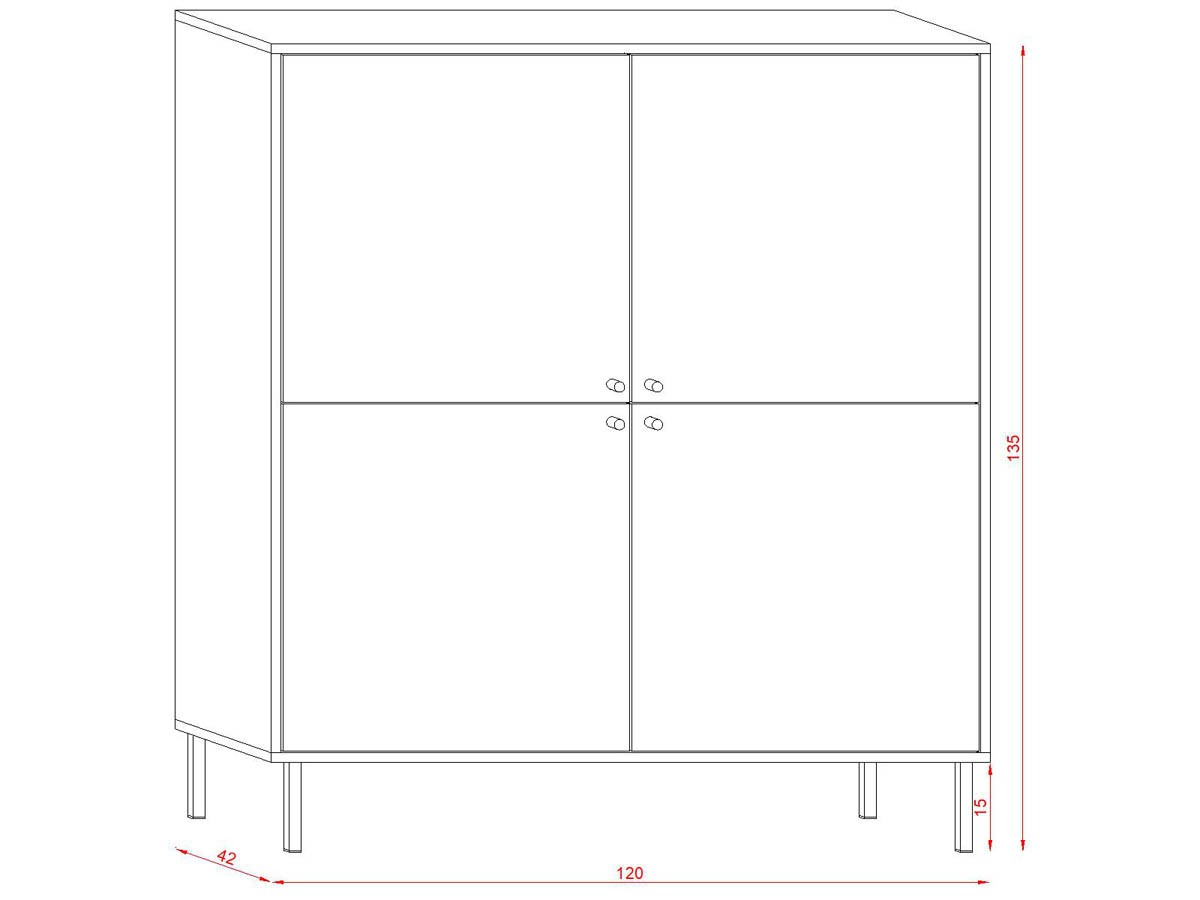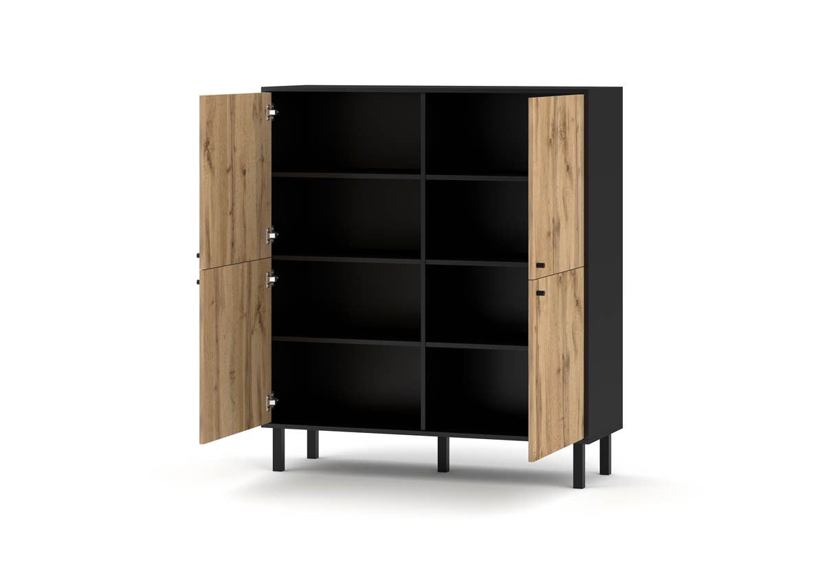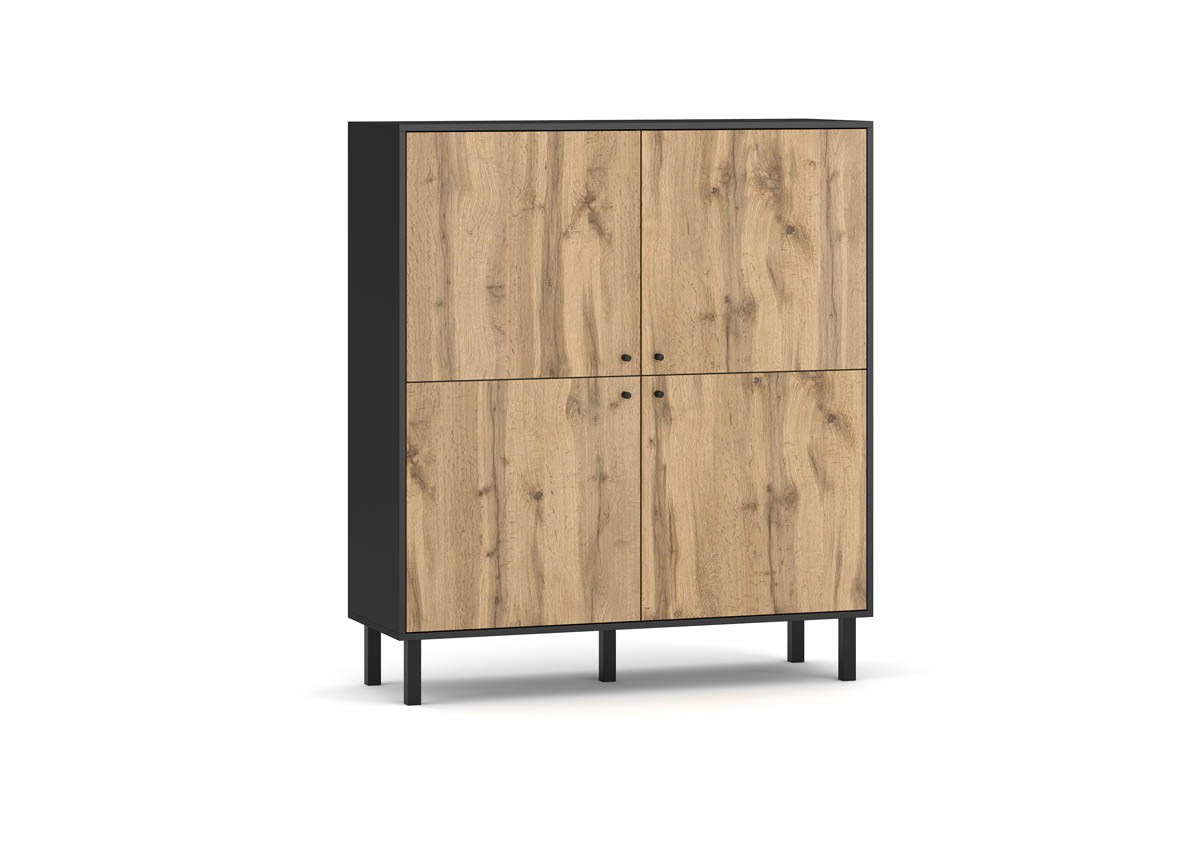 Elegantna visoka komoda JATOK združuje funkcionalnost in stil. Komoda vsebuje štiri vrata, za njimi pa se skriva obilo prostora za shranjevanje različnih predmetov, hkrati pa ohranja vaš prostor urejen. Komoda je dvignjena od tal, kar omogoča enostavno čiščenje pod njo in prispeva k boljši higieni vašega doma.