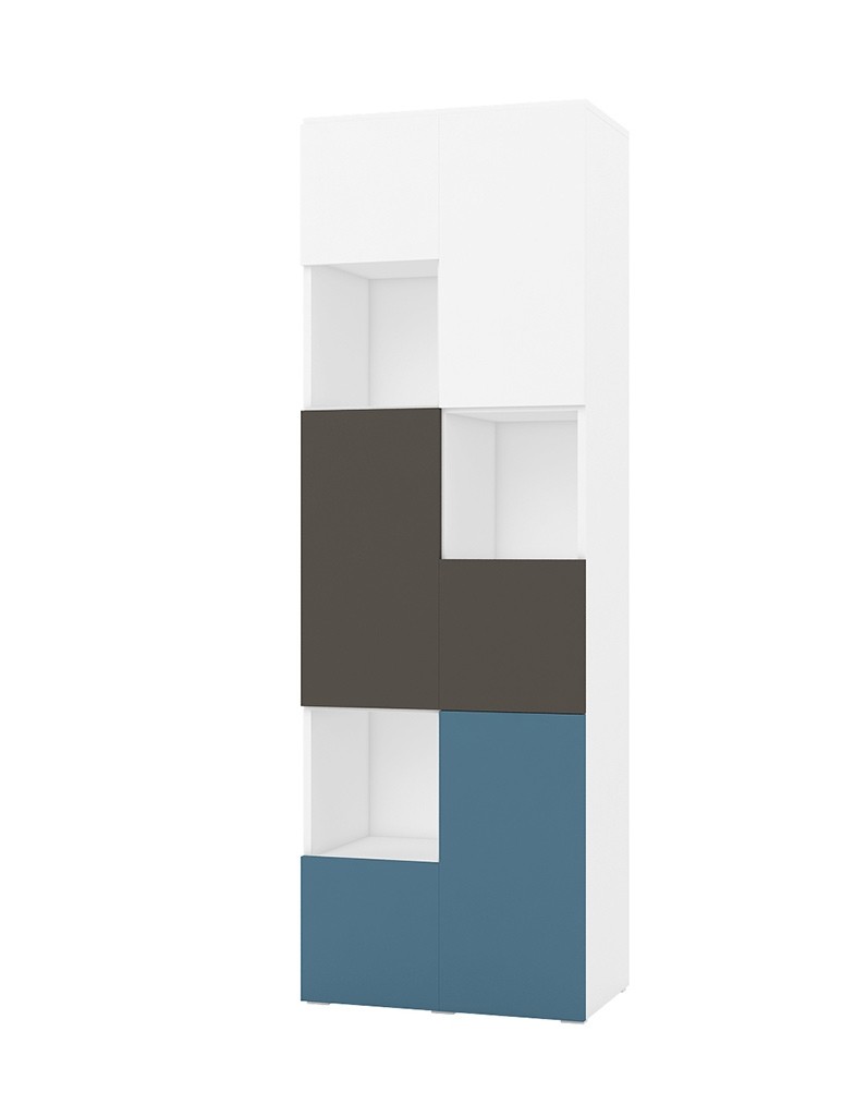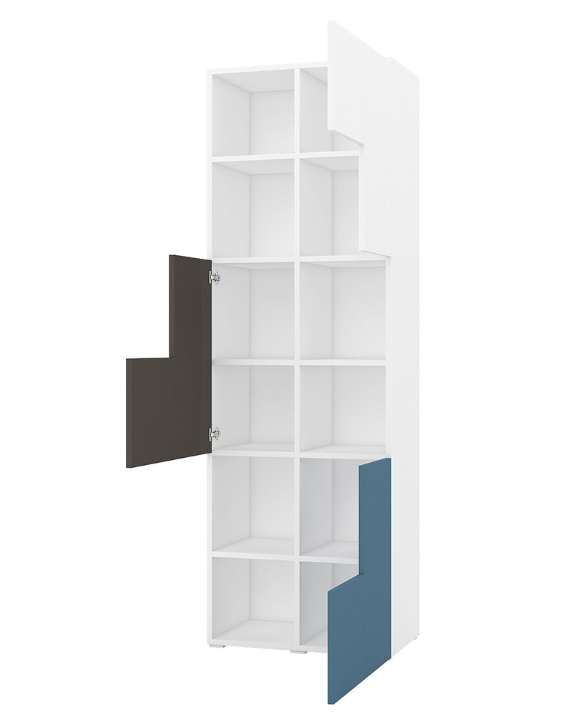 Visoka vitrina JERRY je sestavljena iz kar 12-ih polic, na katere lahko otrok odloži obilo knjig, igrač, šolskih potrebščin, raznih dekoracij ter ostale poljubne predmete. Tri police so odprte, ostale pa so prekrite z vratci različnih barv, ki se ponašajo z modernim geometrijskim dizajnom, ki izgleda odlično v vsaki otroški in mladinski sobi!