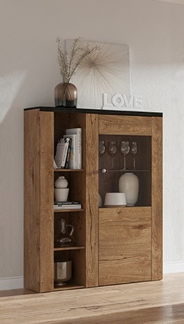 Visoka vitrina LARONA je na voljo v lefkas hrast barvi, ki se odlično poda v vsako dnevno sobo. Visoka vitrina vsebuje steklena vratca kamor lahko pospravite vaše najljubše stvari, ki vam bodo vedno na varnem a vidnem mestu.