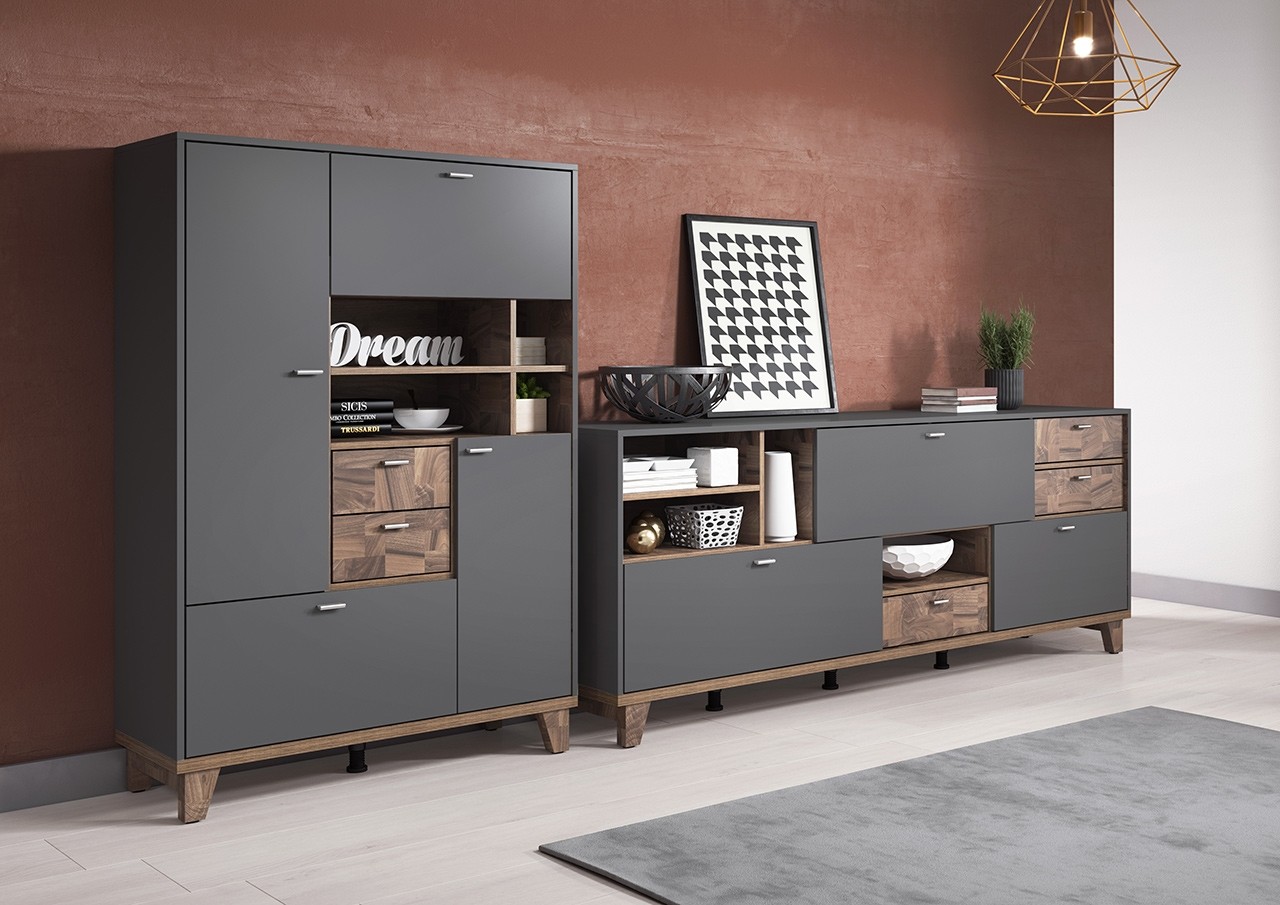Kolekcija OSLO se odlikuje po velikem številu manjših omaric, predalov in polic, ki vam olajšajo ohranjanje reda in čistoče v dnevni sobi. Omogoča izjemno dobro organizacijo najrazličnejših predmetov, zato boste vedno vedeli, kje je kakšna stvar pospravljena.