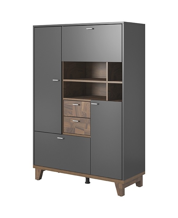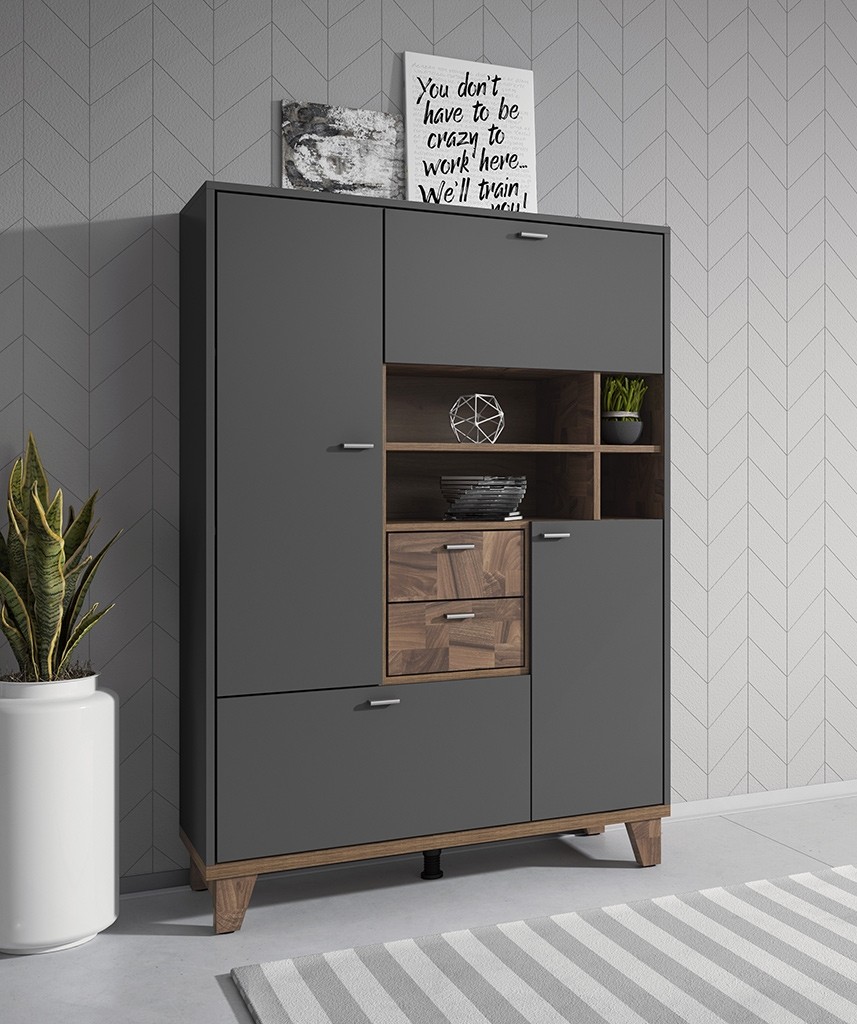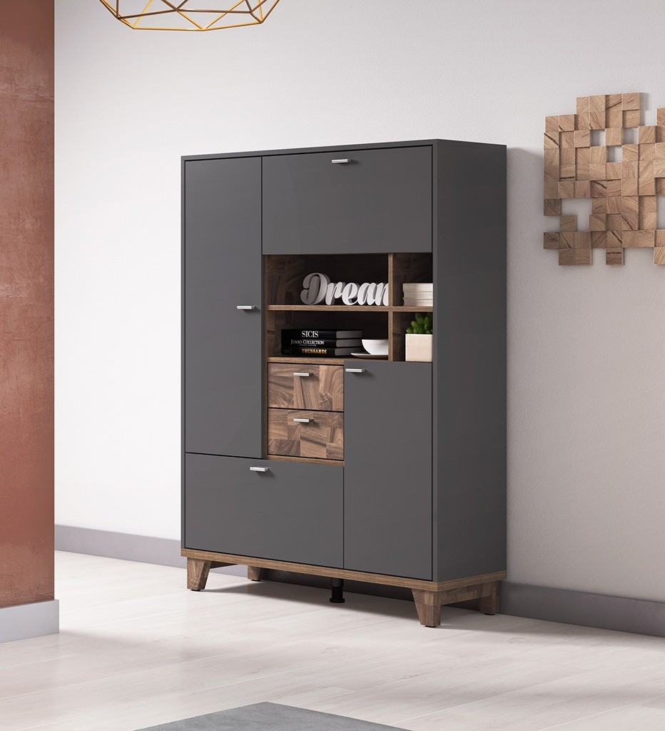 Odlično organizirana visoka vitrina OSLO vam nudi obilo manjših omaric, dva predala in štiri odprte police, zato lahko vanjo pospravite vse sorte predmetov in jih tudi dobro organizirate. Ponaša se s skandinavskim dizajnom, ki odlično izgleda v vsaki dnevni sobi ali jedilnici ter jo naredi bolj moderno!