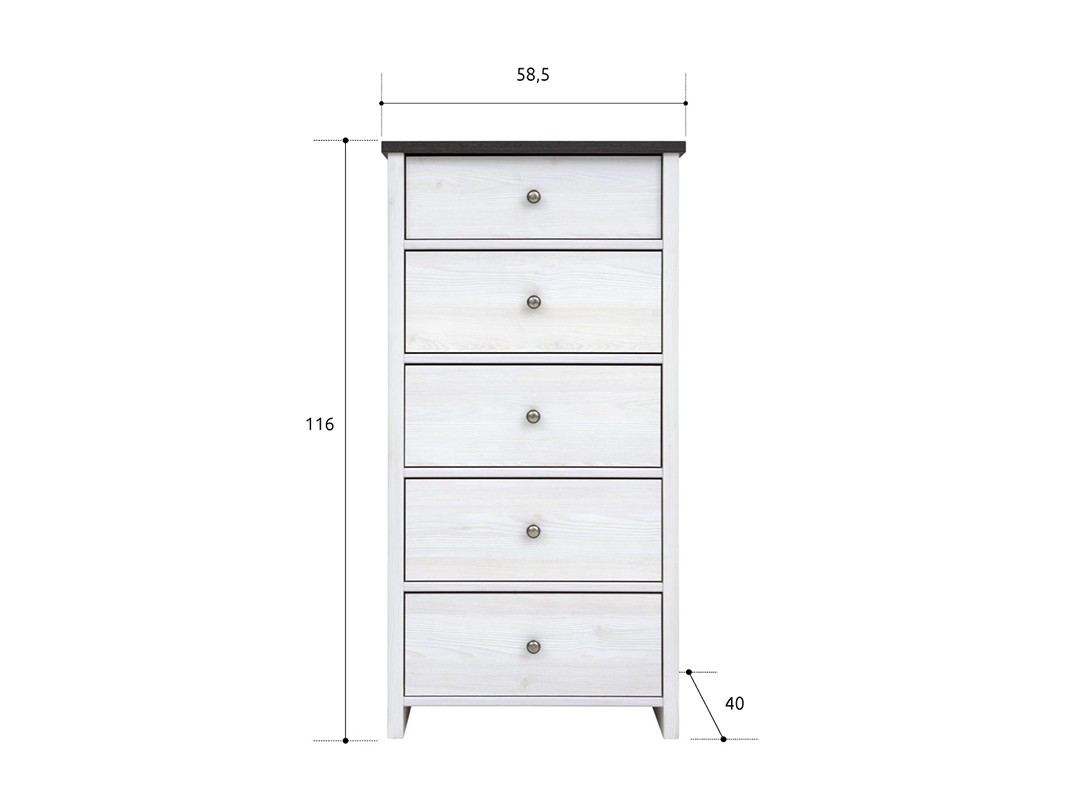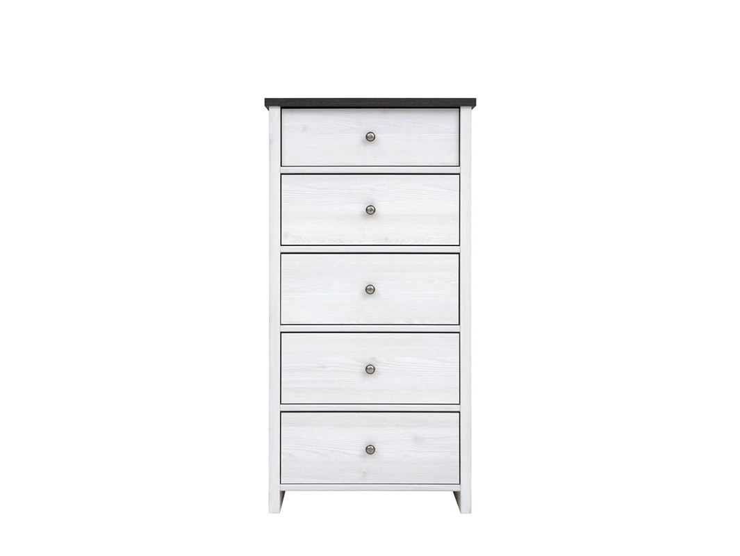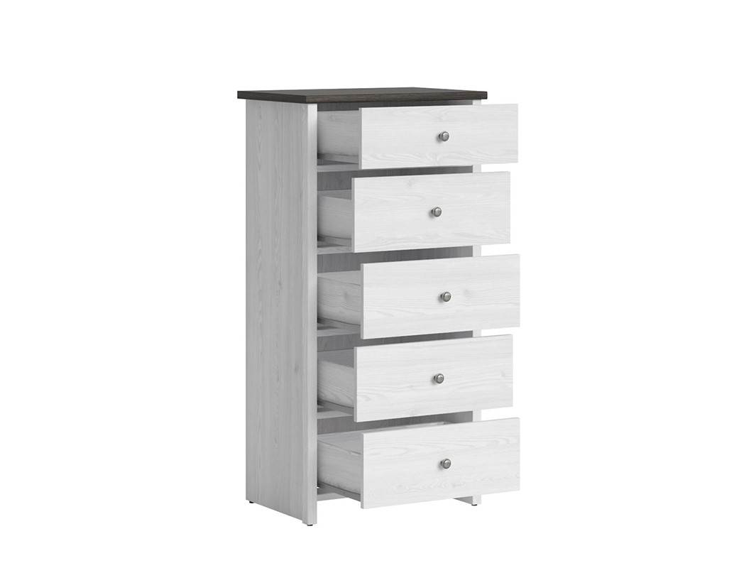 Visoki predalnik PORTO je na voljo v svetlo sivi barvi bora, ki bo poživela vaš prostor. Predalnik nudi veliko shranjevalnega prostora, kamor boste lahko shranjevali oblačila, nakit ali revije. Predalnik vsebuje kar pet predalov, kar pomeni, da bo vaš prostor vedno urejen in pospravljen.