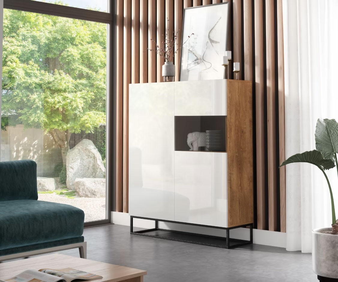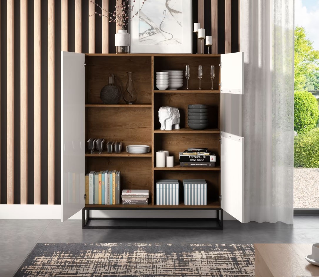 Vitrina AVORIO je sodobnega izgleda in na voljo v kombinaciji hrasta in bele barve visokega sijaja, ki vam bo posvetlila prostor. Vitrina vsebuje veliko shranjevalnega prostora, kar vam omogoča, da bo vaša dnevna soba vedno urejena in pospravljena.