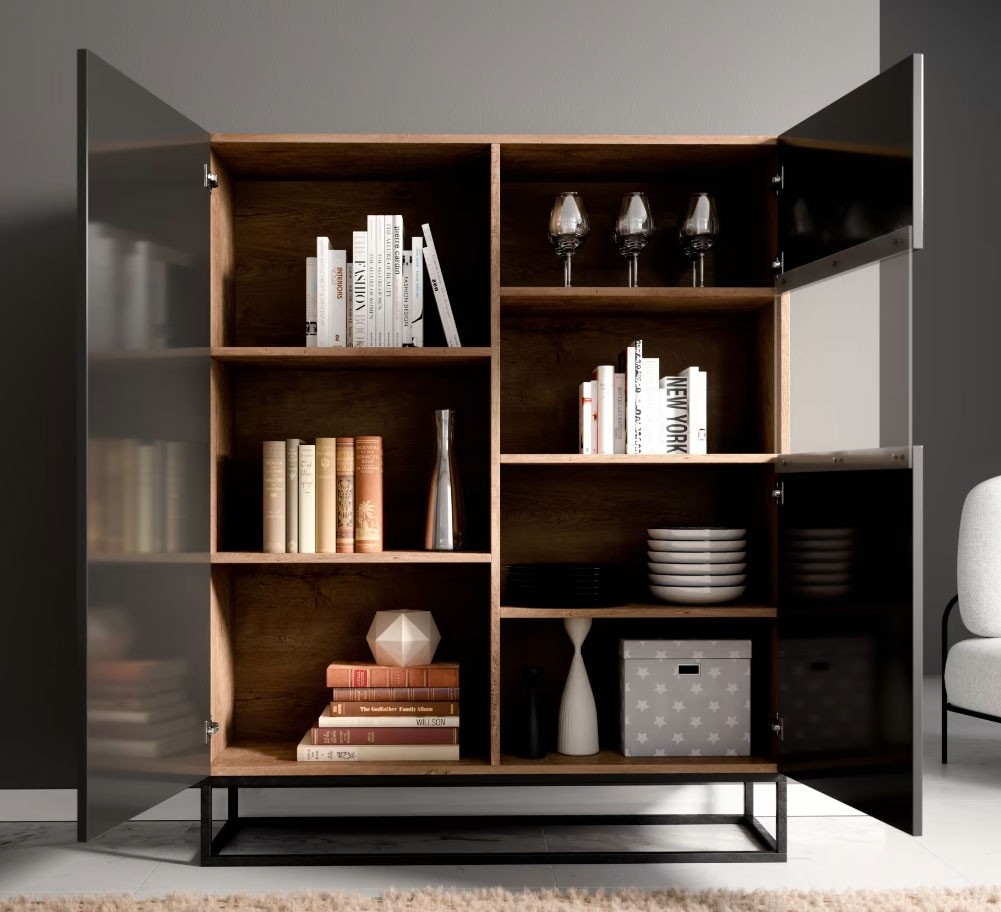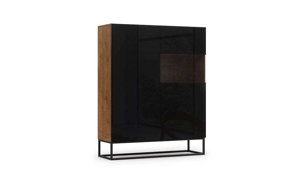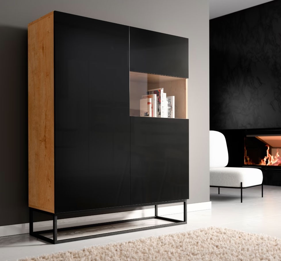 Vitrina AVORIO je sodobnega izgleda in na voljo v kombinaciji hrasta in črne barve visokega sijaja. Vitrina vsebuje veliko shranjevalnega prostora, kar omogoča, pospravljeno in urejeno dnevno sobo.