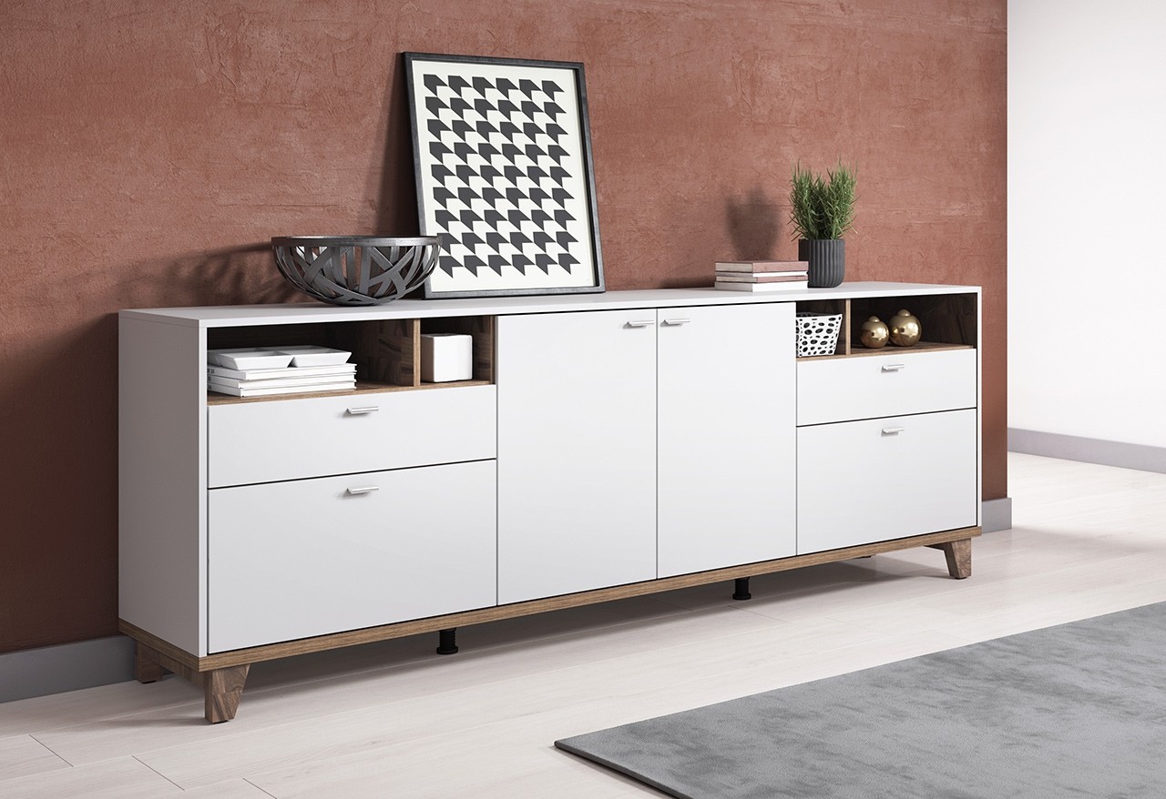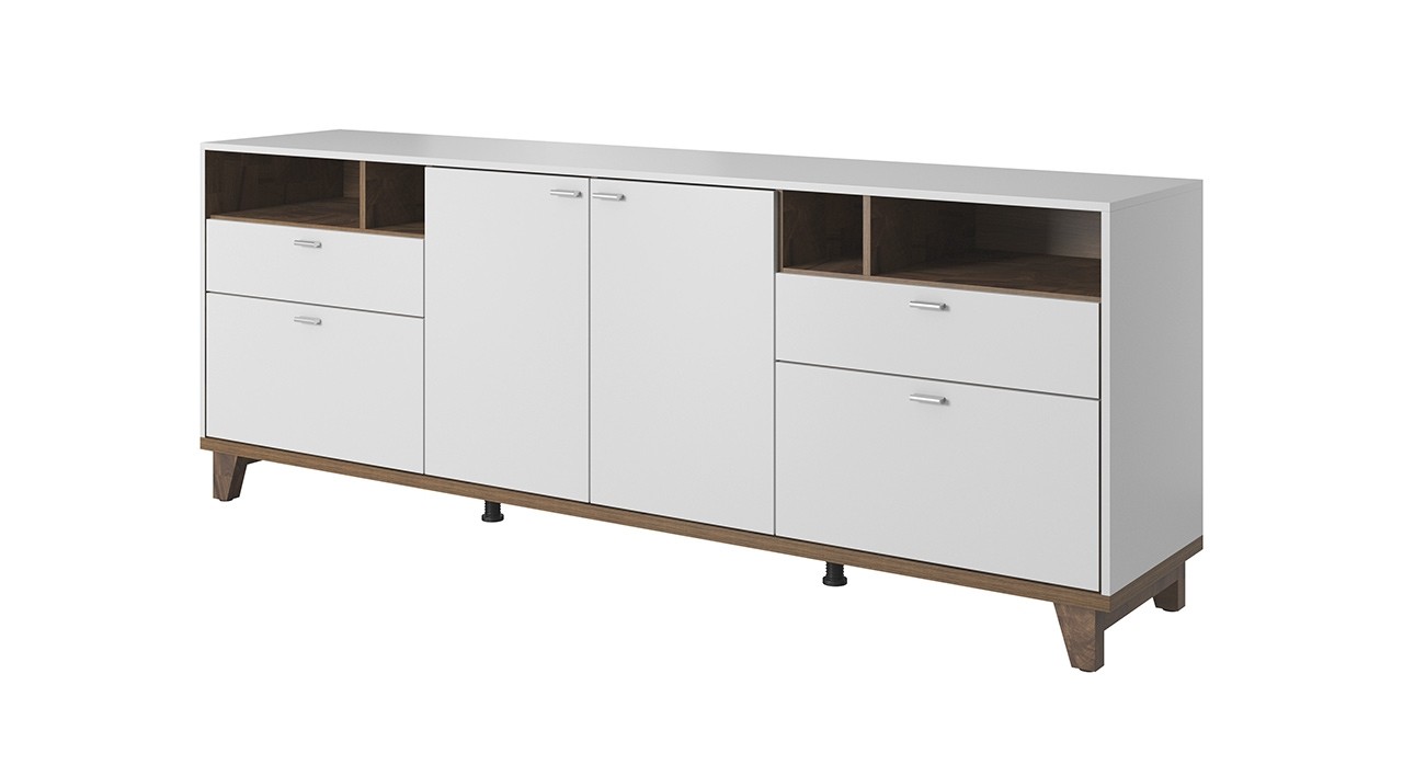 Opremite svojo dnevno sobo, jedilnico ali predsobo z izjemno funkcionalno komodo OSLO, ki nudi obilo prostora za shranjevanje. Omarica je razdeljena na 4 manjše omarice, 2 predala in 4 odprte police, zato nudi odlično organizacijo revij, knjig, DVDjev, družabnih iger in ostalih malenkosti katere želite imeti lepo pospravljene.