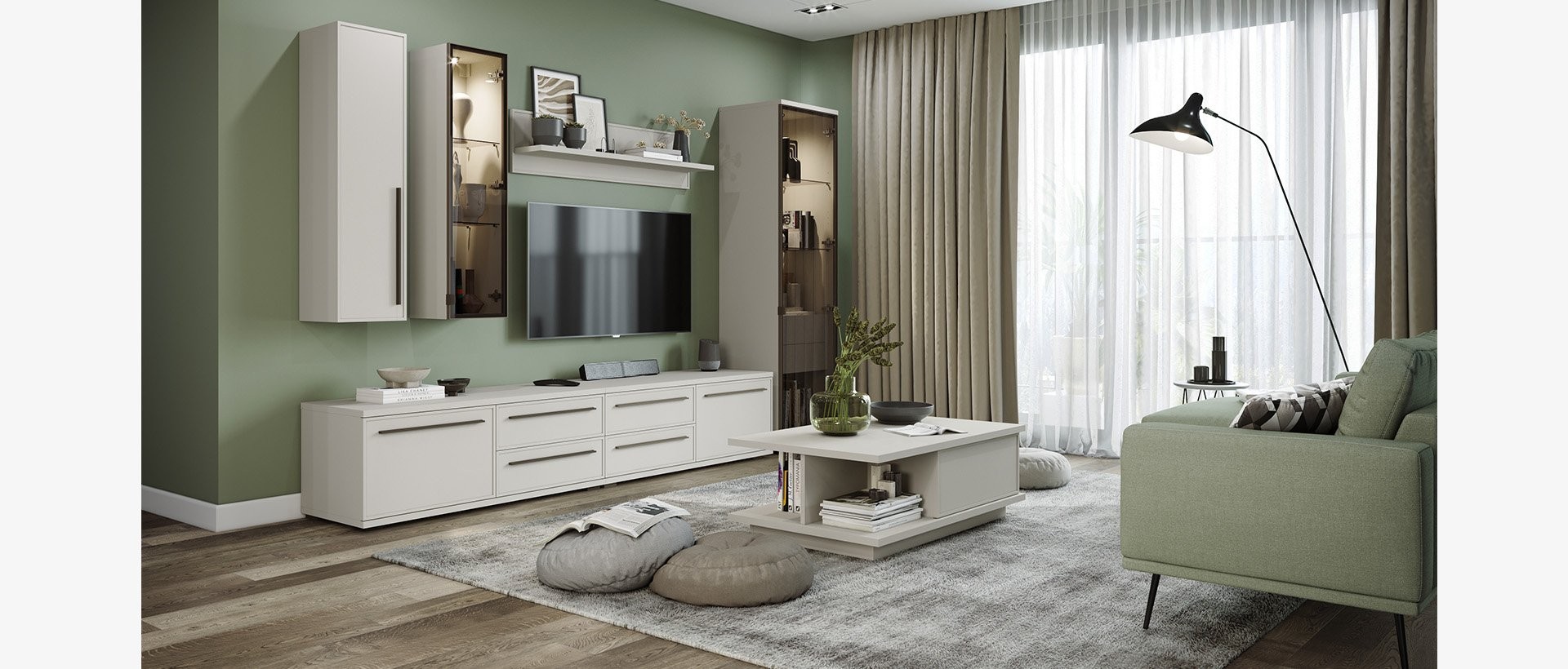 Vitrina Radda Opera V52-1AL je popolna izbira za vsak dom, ki si želi elegantne in funkcionalne rešitve za shranjevanje. S svojim modernim dizajnom in prefinjenimi detajli se odlično ujema z različnimi ambienti. Lakirana v nežnem mat UV laku v barvi Kašmir in dopolnjena z aluminijastim okvirjem s steklom, prinaša prestižen videz in brezčasno eleganco. Notranjost v dekorju Textil zagotavlja sofisticiran kontrast in dodaja pridih razkošja. Vgrajena LED osvetlitev poudarja vsebino vitrine in ustvarja prijetno vzdušje v prostoru.