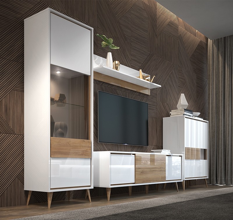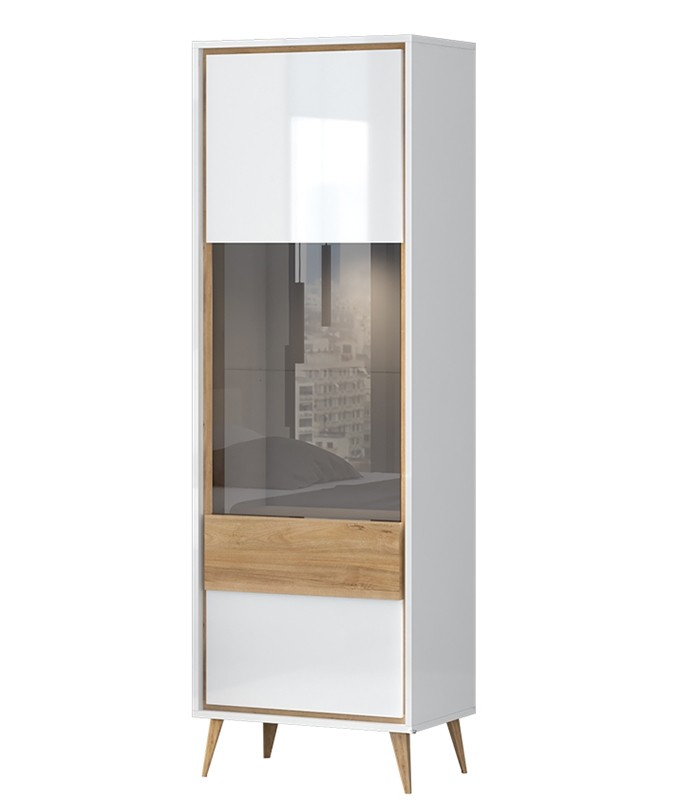 Vitrina je na voljo v kombinaciji kristalno bele barve in pacifičnega oreha v visokem sijaju. Pohištvo v visokem sijaju odbija svetlobo in zato v domu ustvari bolj svetel in zračen prostor, zato boste vanj z veseljem povabili vaše najdražje.