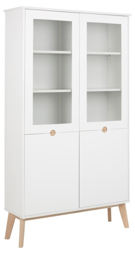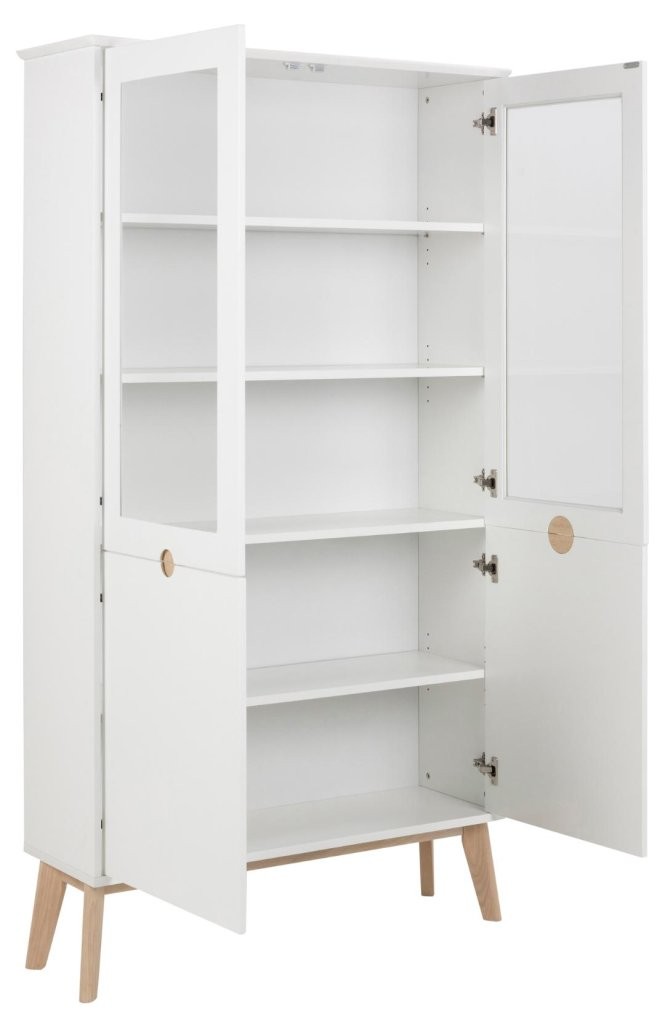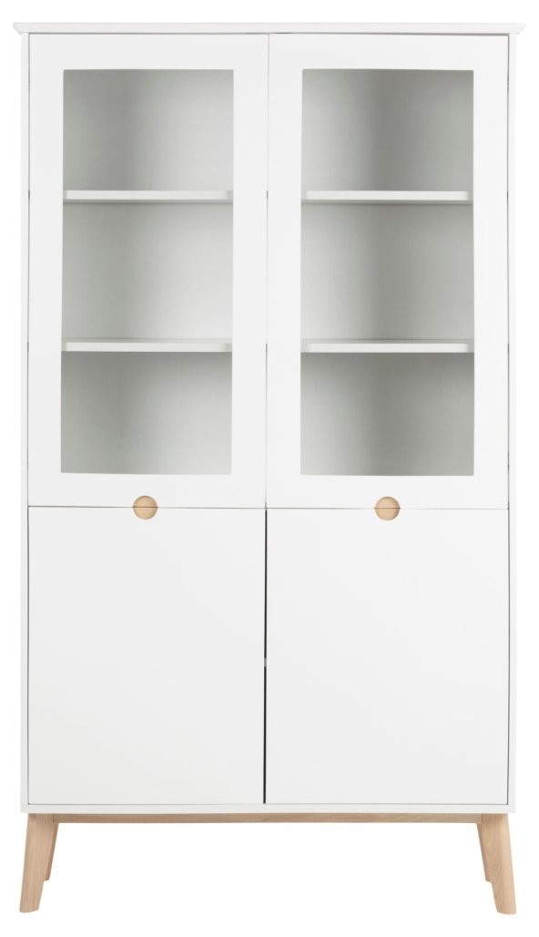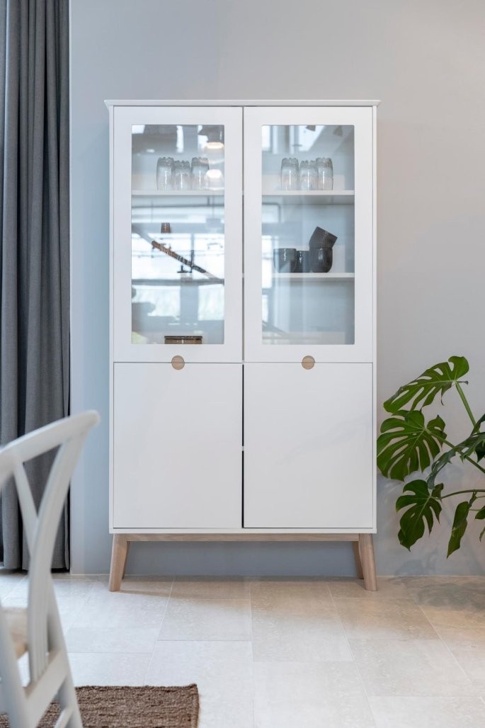 Moderna klasika s tradicionalnimi referencami, vitrina Tally ponuja obilo prostora za shranjevanje. Bela površina nudi čist videz ki se popolno ujema z belo oljenimi hrastovimi nogami. Pokažite svoje najljubše dekorativne predmete iza steklenih vrat, medtem ko lahko neurejenost rešite z vratci spodaj. Poleg tega je eden izmed ključnih atributov te vitrine integriran ročaj, ki omogoča preprosto odpiranje in zapiranje.