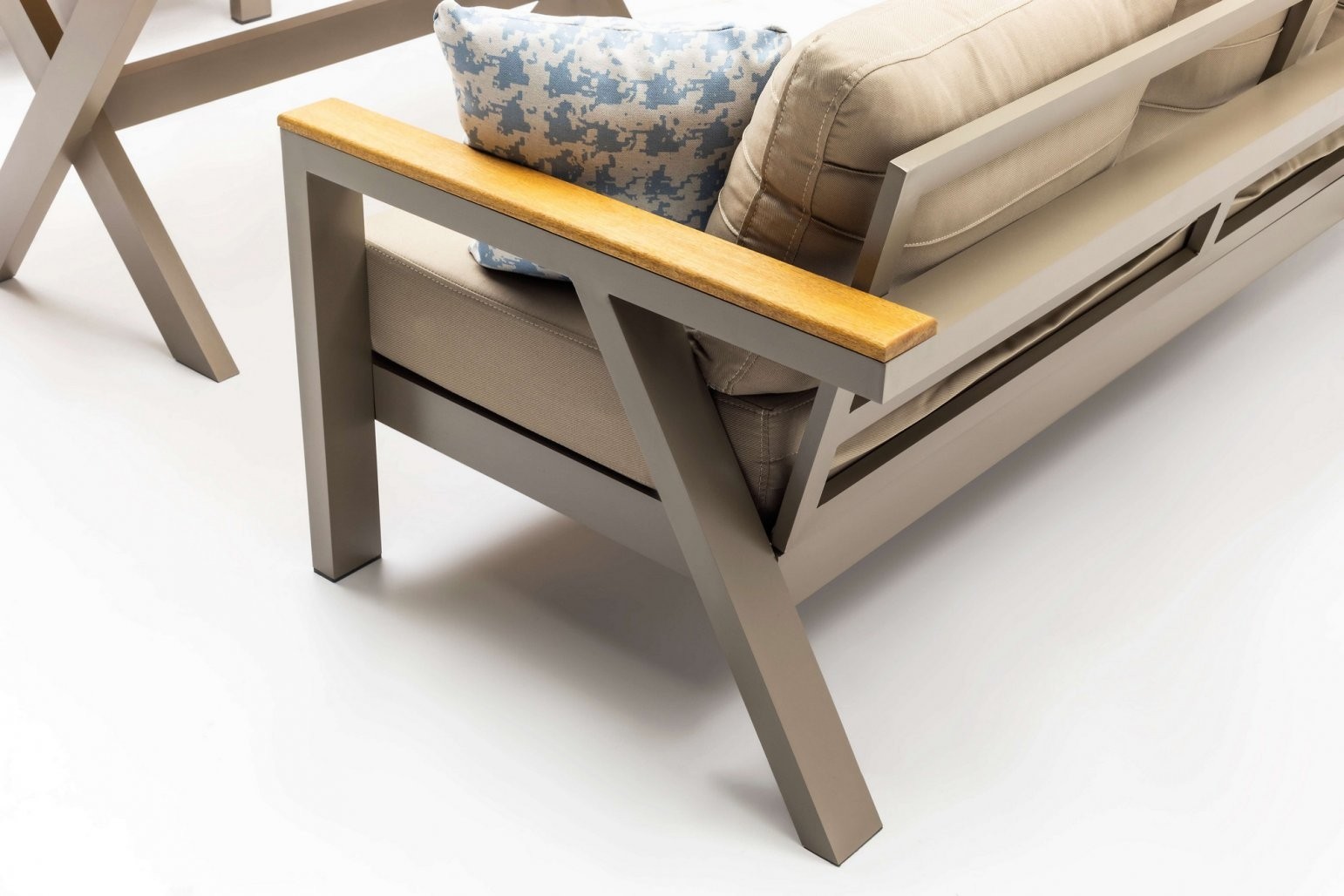 Vrtna garnitura Terra je posebej oblikovana za udobje in slog. S svojim prostornim trosedom, dvema foteljema, mizo in dvema taburejema, ponuja veliko prostora za sprostitev in uživanje na prostem. Edinstvena prednost nakupa te garniture je njen odporen aluminijast okvir in vrh mize iz masivnega iroko lesa, ki sta oblikovana za dolgotrajno zunanjo uporabo.