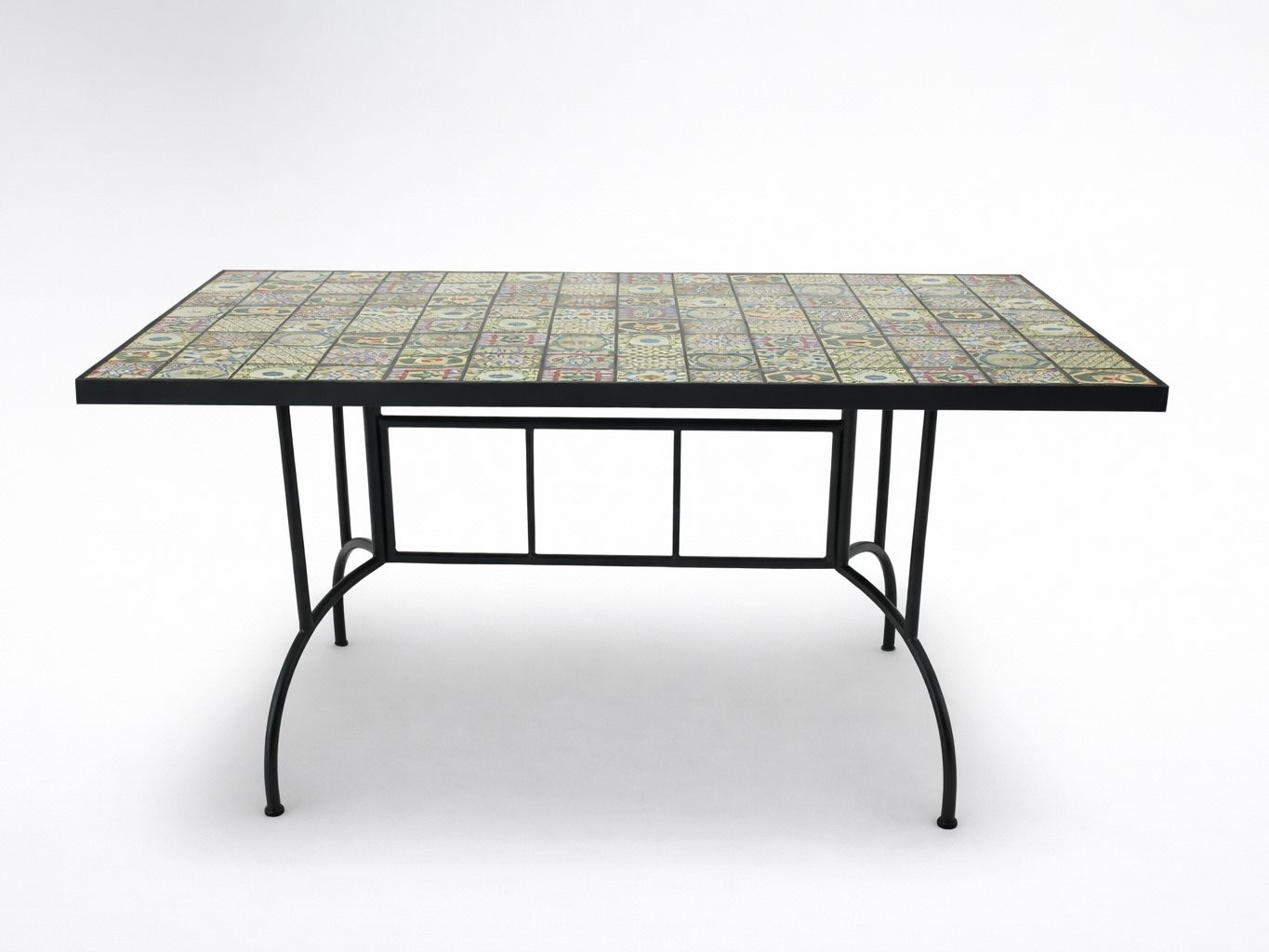 Mozaična mizna plošča poudari izrazit dekorativen videz. Pravokotna oblika je primerna za več oseb. Miza se poda klasičnim in sredozemskim zunanjim postavitvam.