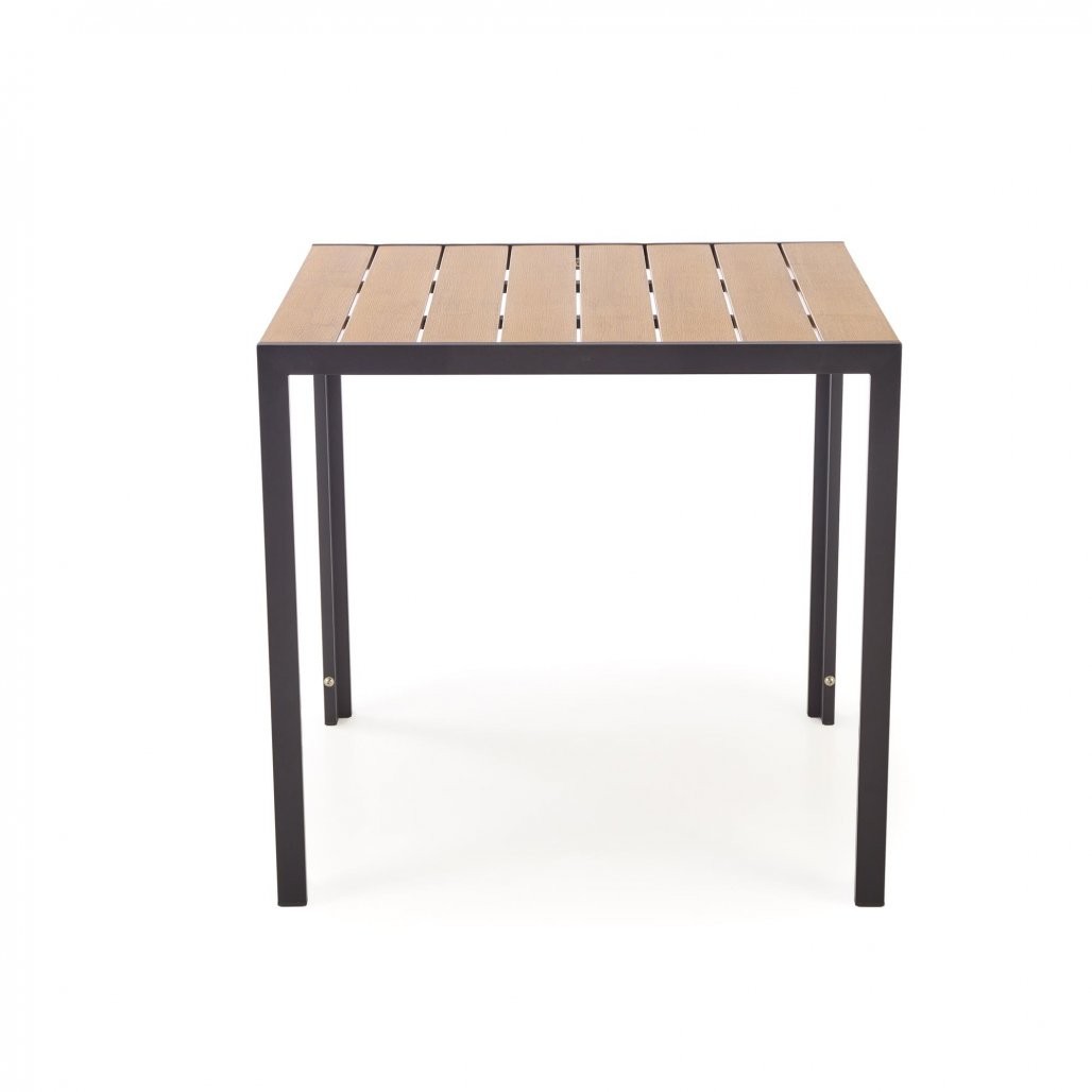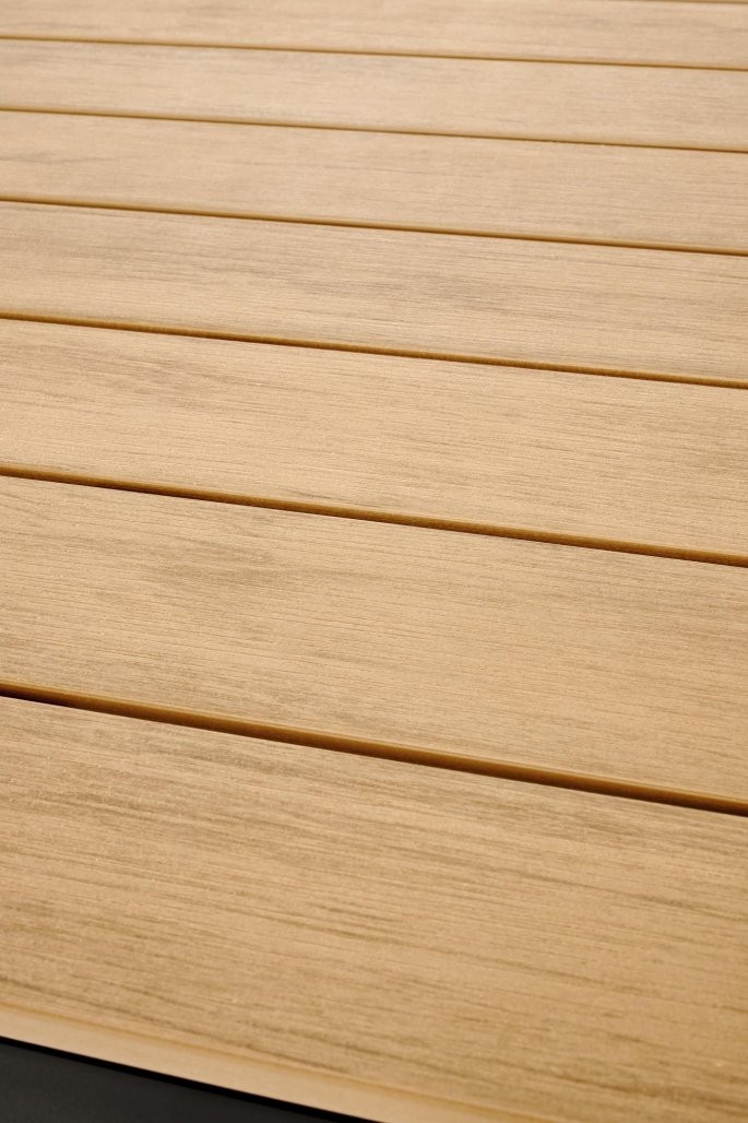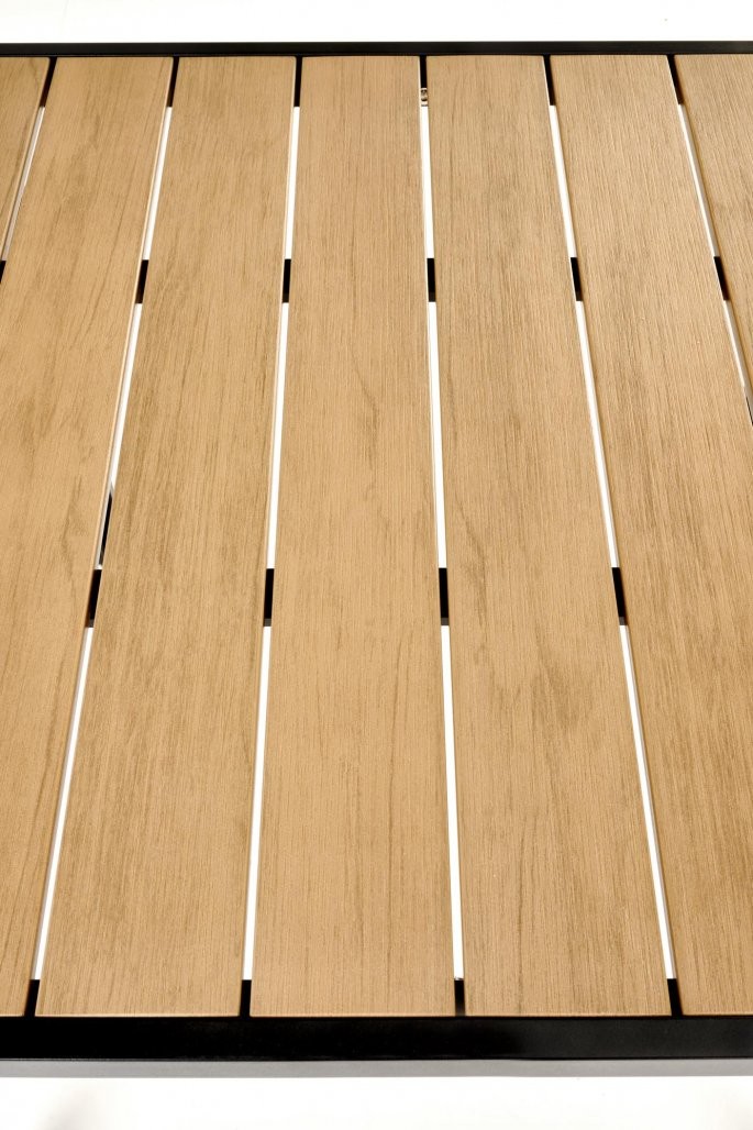 Miza je izdelana iz kakovostnih materialov, ki zagotavljajo dolgo življenjsko dobo. Okvir je iz aluminija, kar poskrbi za stabilnost in odpornost proti koroziji, površina pa je iz trpežnega polistirena, ki je enostaven za čiščenje. Kombinacija aluminija in polistirena omogoča, da miza prenese vsakodnevno uporabo in ohrani eleganten črno-rjav videz.
