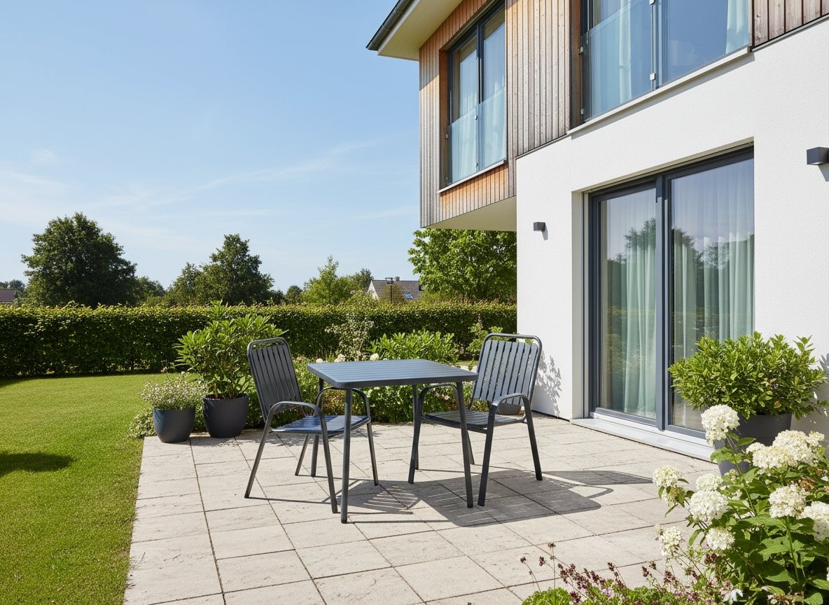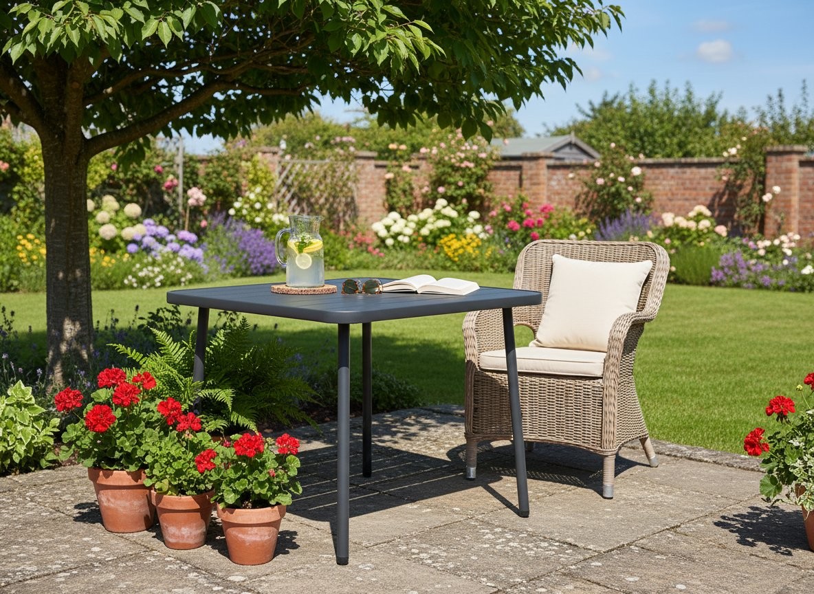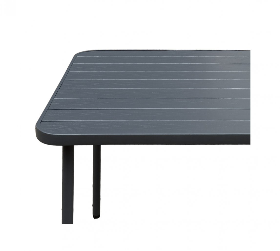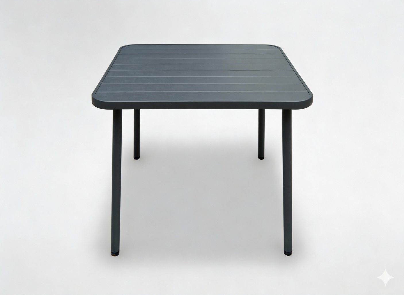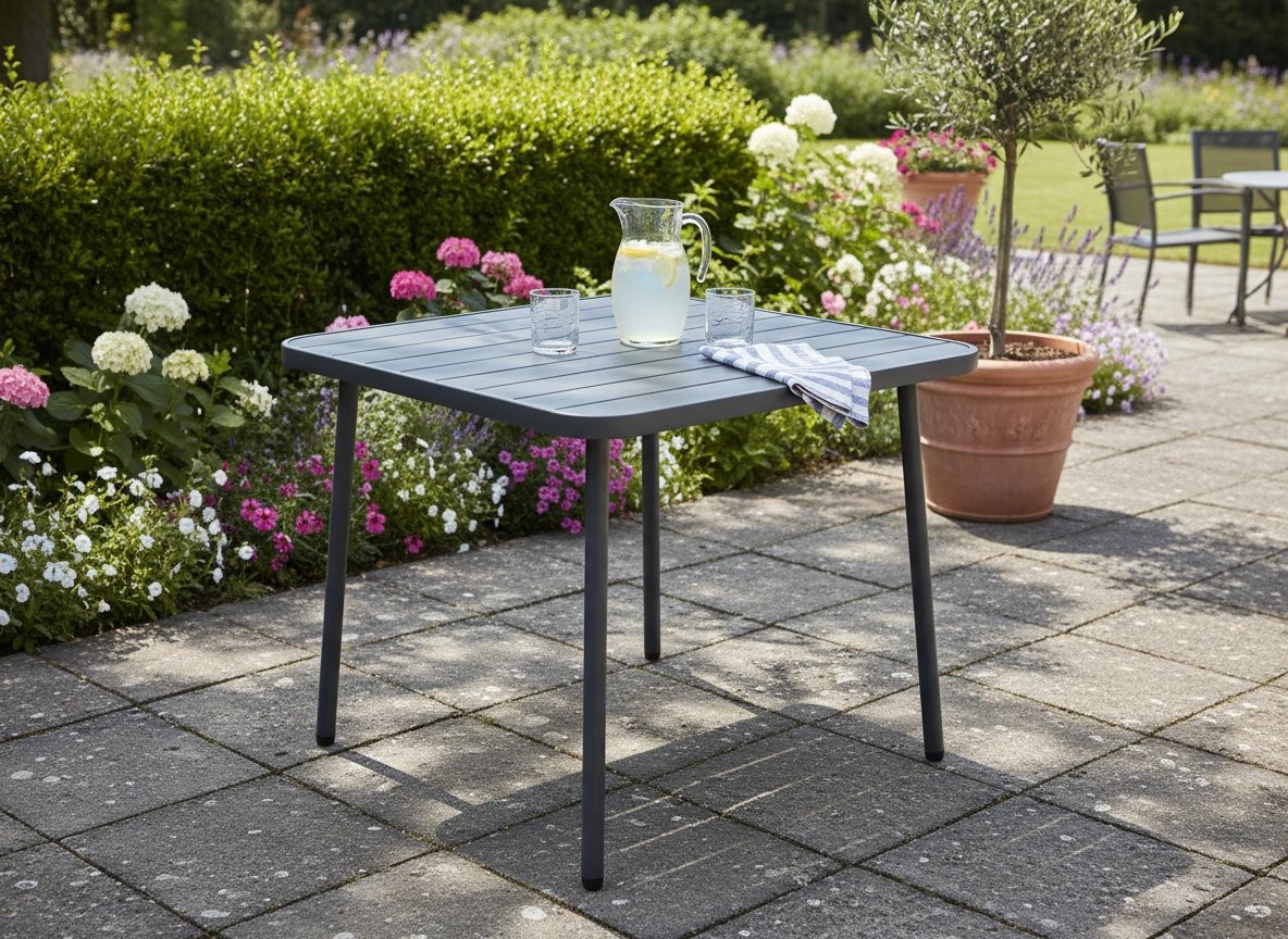 Kvadratna oblika je primerna za manjše terase ali balkone. Kovinska mizna plošča iz letvic olajša vsakodnevno uporabo in čiščenje. Temno siva barva deluje umirjeno in sodobno.