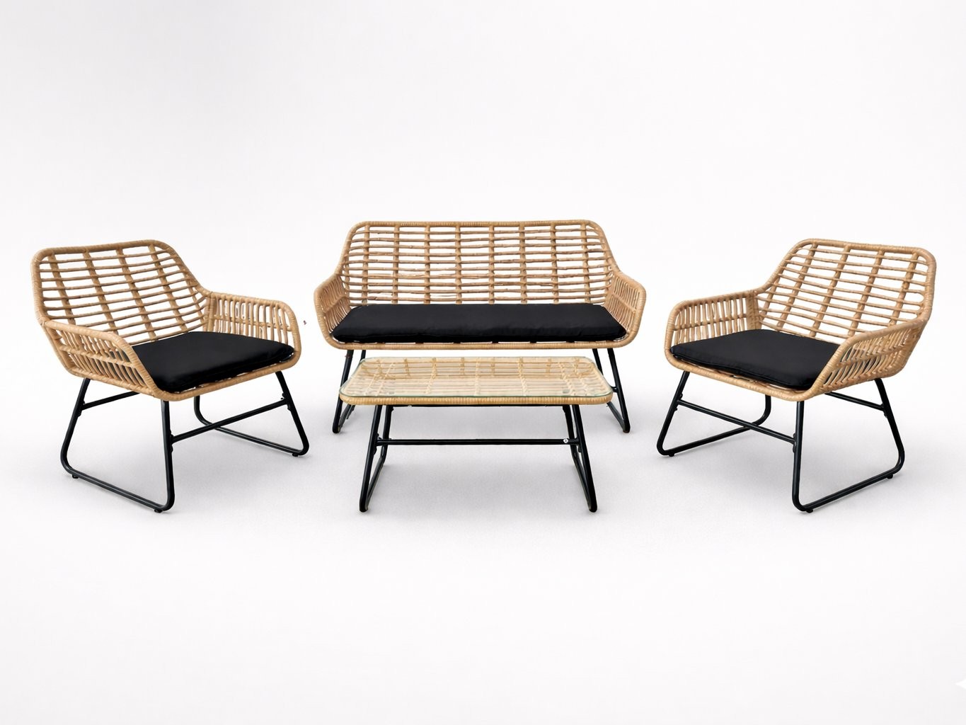 Komplet vključuje dve kotni sedišči, dva tabureja in mizo, zato je primeren za druženje več oseb. Blazine debeline 10 cm povečajo udobje pri sedenju, tabureja pa lahko pospravite pod mizo in tako prihranite prostor. Set je primeren za vrt, teraso ali verando.