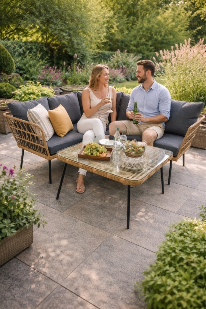 Vrtni kotni set Narela (siv) je prostoren kotni komplet za vrt, teraso, balkon ali verando. Po originalnem opisu ima rjav ratan in sive blazine, zato združuje topel videz pletiva z umirjenim tekstilnim dodatkom.
