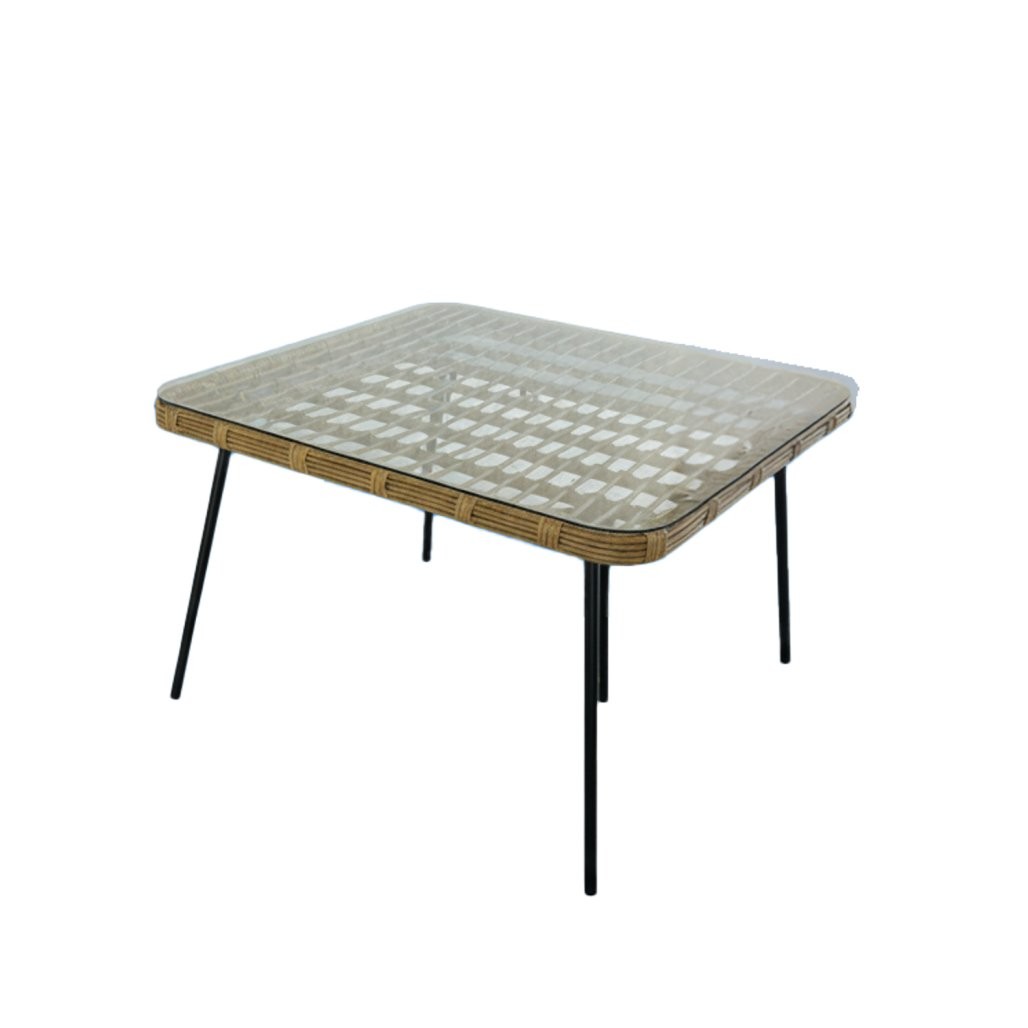 Komplet vključuje dva kavčna segmenta in klubsko mizo s stekleno ploščo. Pocinkana jeklena konstrukcija prispeva k odpornosti proti rji, kombinacija okroglega in ravnega ratana pa poudari sodoben videz.