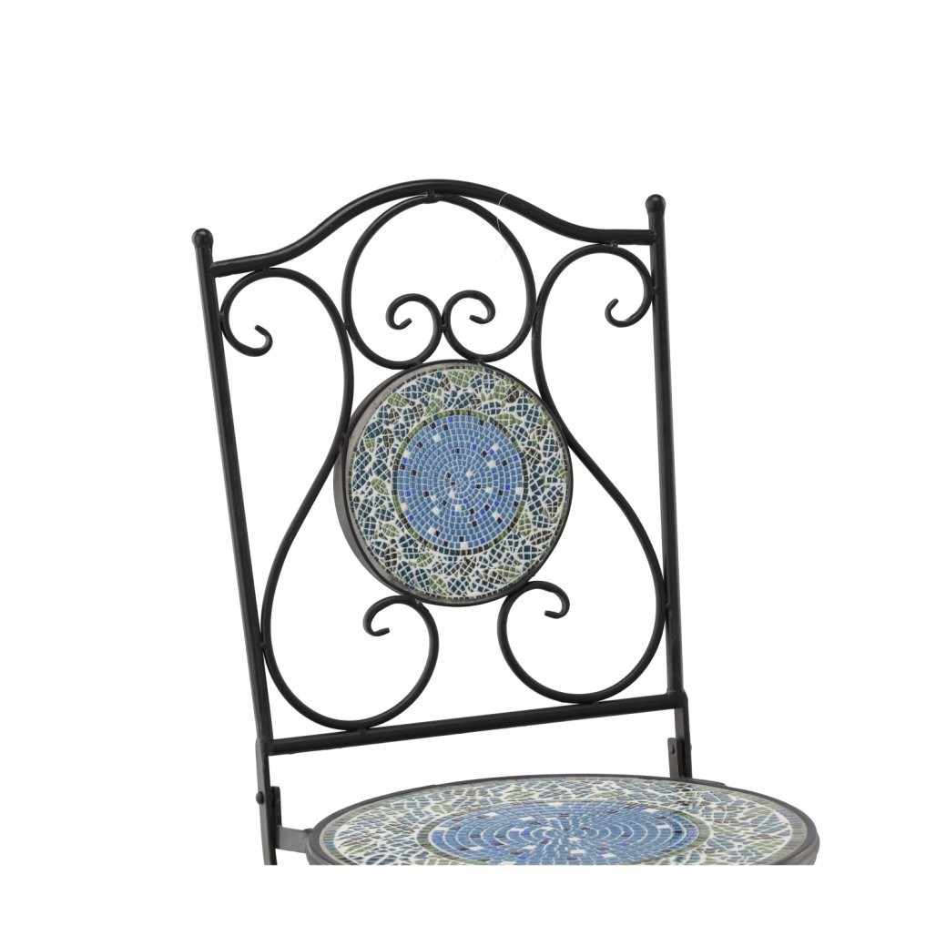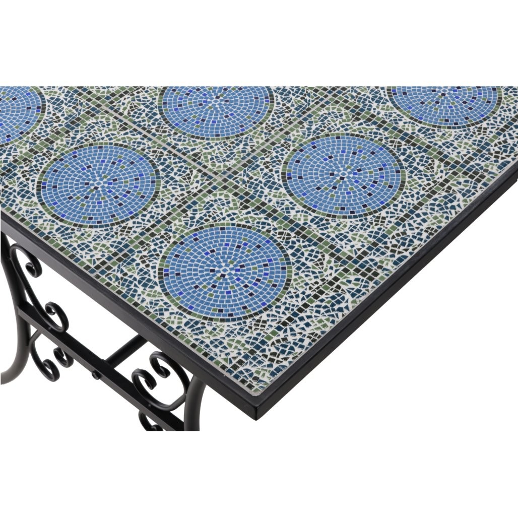 Vrtni mozaični set Okeanos prinaša premišljeno rešitev za urejeno in udobno zunanjo jedilno ali sprostitveno površino. Izvedba v odtenkih črna kovina, moder mozaik omogoča enostavno usklajevanje z različnimi zunanjimi ambienti. Materiali, kot so kovina, keramični mozaik, prispevajo k urejenemu videzu in praktični uporabi.