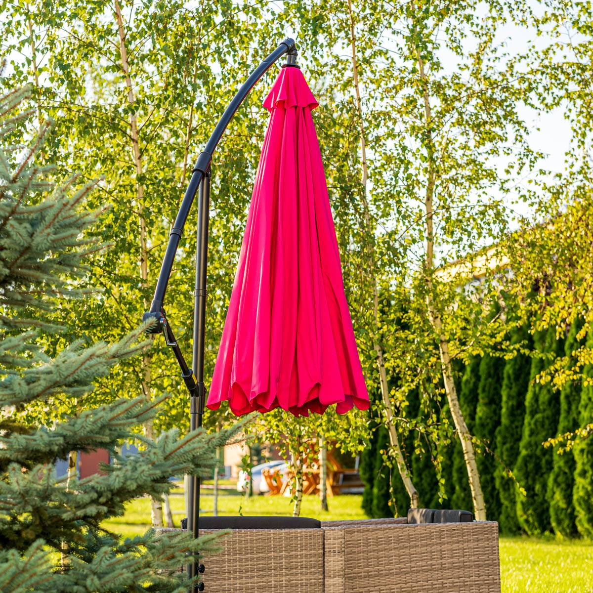 Vrtni senčnik NIRVANA je primeren za vrt ali teraso. Senčnik je zelo enostaven za uporabo, saj za odpiranje in zapiranje uporabljate isto ročico, ki jo navijate ob raztegovanju ali zapiranju. Senčnik je varen saj ima kovinsko ogrodje, poliester na vrhu senčnika pa je tisti, ki vam nudi senco na vroče poletne dni. Na voljo je v roza barvi.
