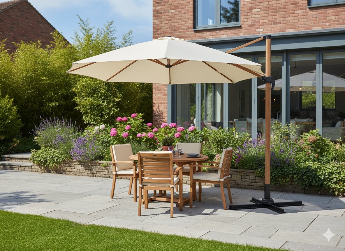 Vodoodporna tkanina Oxford 250 g/m² pomaga pri zaščiti pred soncem in spremenljivim vremenom. Nastavljiv naklon in vrtenje za 360° omogočata natančnejše usmerjanje sence. Konstrukcija iz aluminija in jekla poudari stabilno zasnovo. Prezračevalna odprtina izboljša kroženje zraka, priložena prevleka pa olajša shranjevanje.