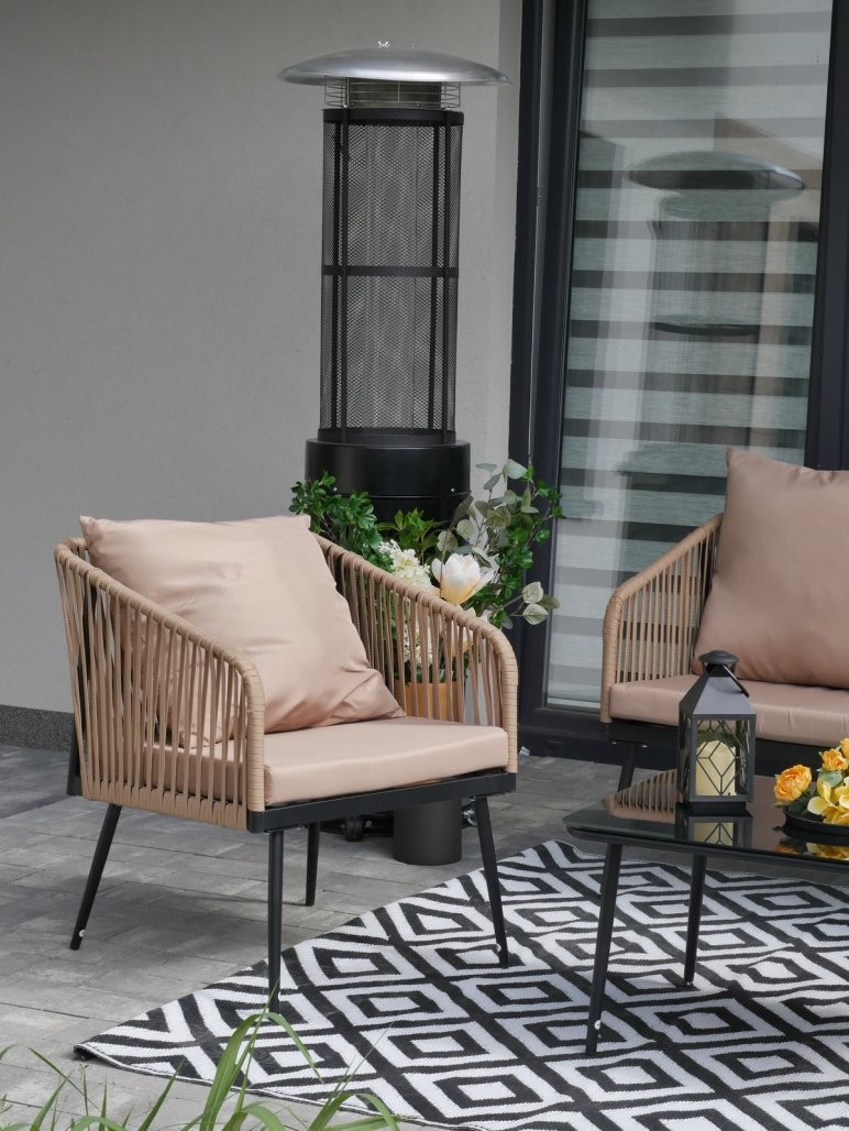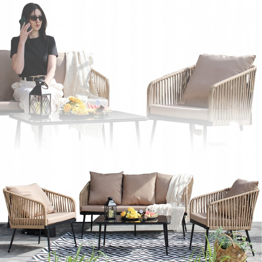 Vrtni set Jalen iz pletene vrvi s kavčem (2 foteljema in mizico, bež) je premišljeno zasnovan komplet za udobno uporabo in usklajen videz prostora. Bež odtenek deluje nevtralno in se lepo vključi v različne postavitve. Pri izdelavi so uporabljeni materiali, kot so jeklo, kaljeno steklo in poliester.
