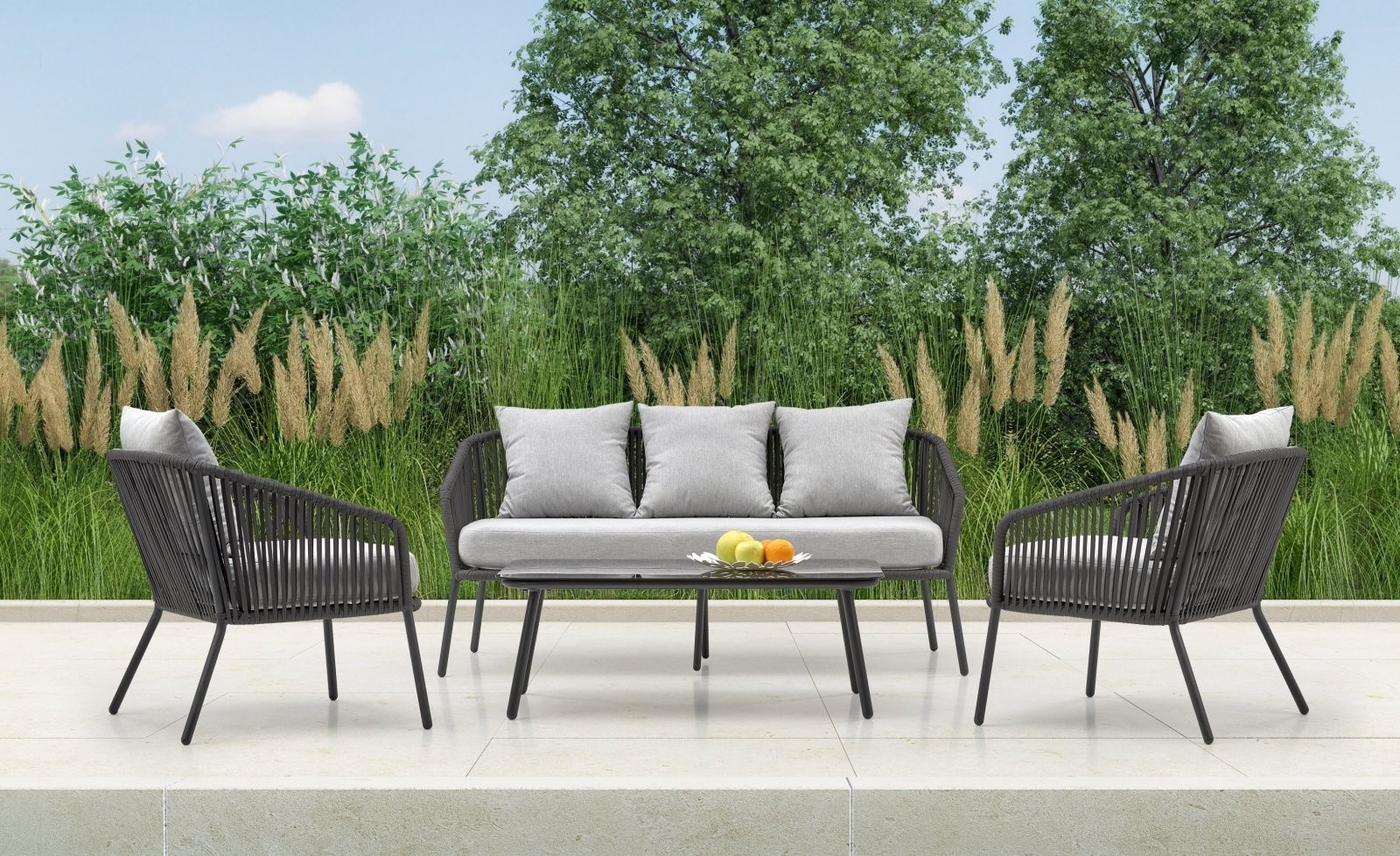 Vrtni set Viraen z aluminijastim ogrodjem in udobno tkanino je popoln za sodobno teraso. Vrtni set vključuje sedežno garnituro in mizico za popolno zunanje sproščanje.