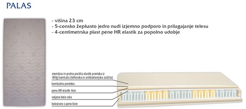 • Model Palas predstavlja sodobno vzmetnico, ki v svoji notranjosti skriva visoko kvalitetne in sodobne  materiale umetne mase (pene)