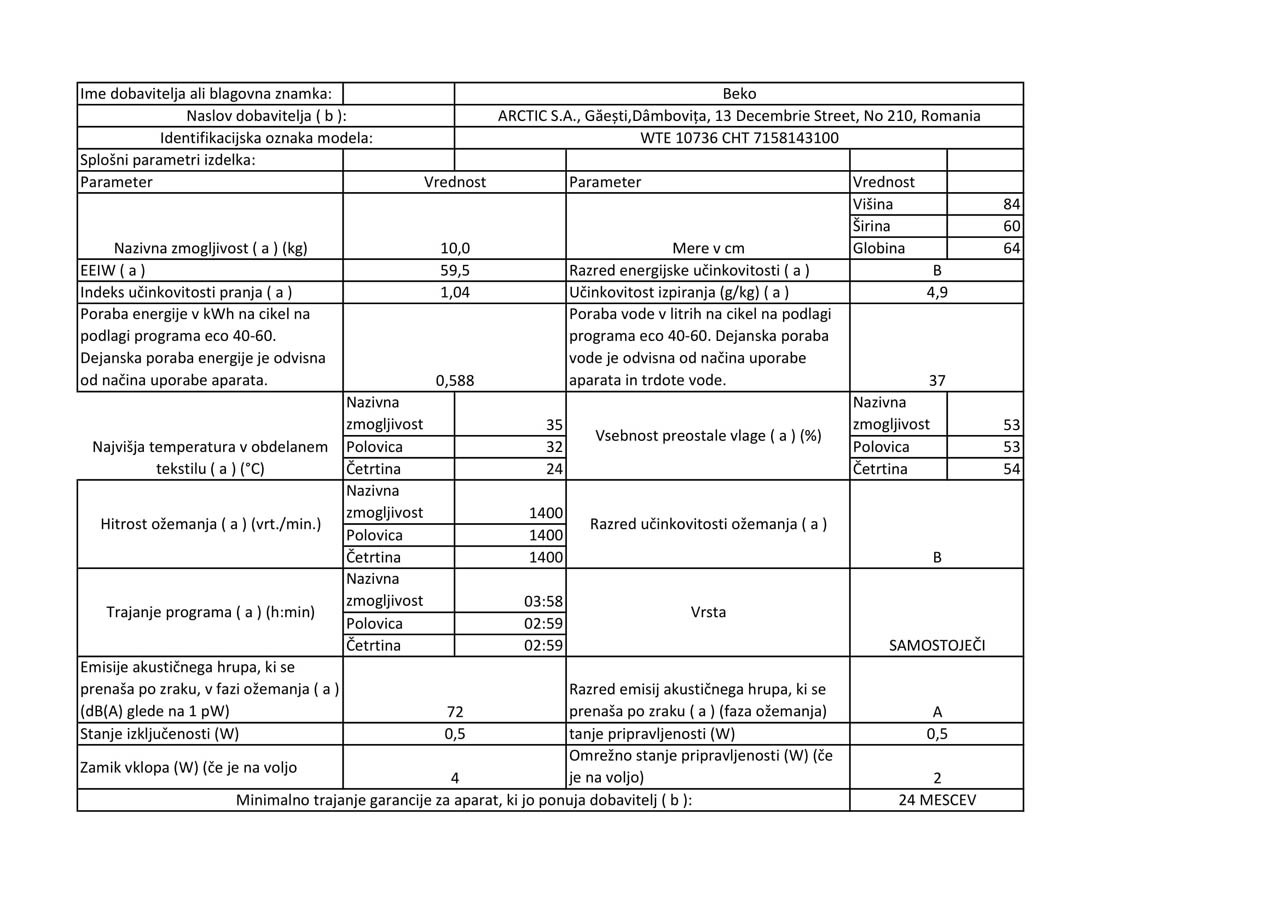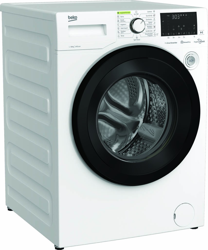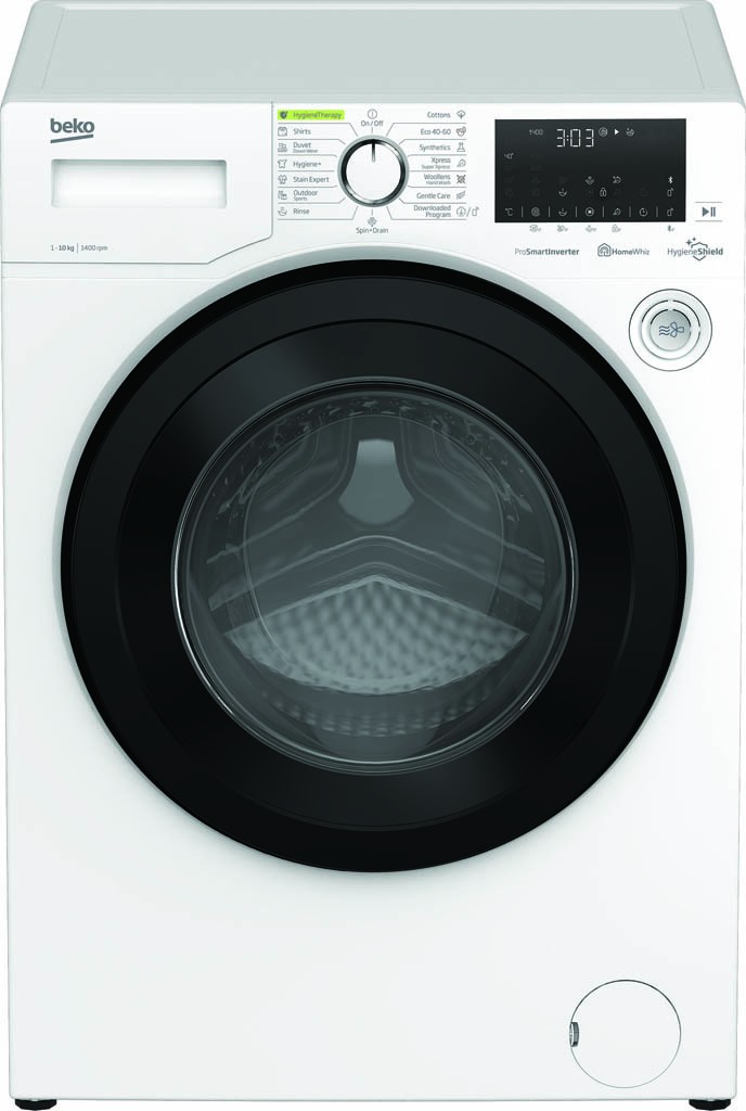 Pralni stroj Beko WTE10736CHT s kapaciteto pranja do 10 kg izstopa z novo tehnologijo HygieneShield. Beko je med prvimi na svetu vgradil tehnologijo kroženja toplega zraka HygieneTherapy, ki s pametnim algoritmom, dodatnim grelnim kanalom in sistemom ventilatorjev, napolni boben z vročim zrakom, da perilo ostane na 60°C in je tako temeljito oprano, kljub manjši porabi vode. Možnost dodatne funkcije Anticrease+ odpravi nezaželeno mečkanje perila dočim funkcija Drum Clean+ skrbi za higiensko čist boben. Tehnologija ProSmart invertnega motorja ponuja visoko energetsko učinkovitost B, tišje delovanje, boljšo učinkovitost pranja in kar 10-letno garancijo na svoje delovanje. Zahvaljujoč novi tehnologiji bobna Aquawave bodo vaša oblačila kljub pogostemu pranju ostala kot nova. Poleg običajnih programov pranja, ga od drugih loči tudi program za odstranjevanje trdovratnih madežev Stain Expert, ki je kos kar 24 različnim vrstam madežev, program za higieno pri nižji temperaturi Hygiene, program za volno in program DownWear poskrbi za oblačila in odeje, ki vsebujejo perje. Na voljo imate izjemno kratek program XpressSuperShort za hitro pranje manj umazanega perila – program opere 2 kg perila v zgolj 14-ih minutah.
