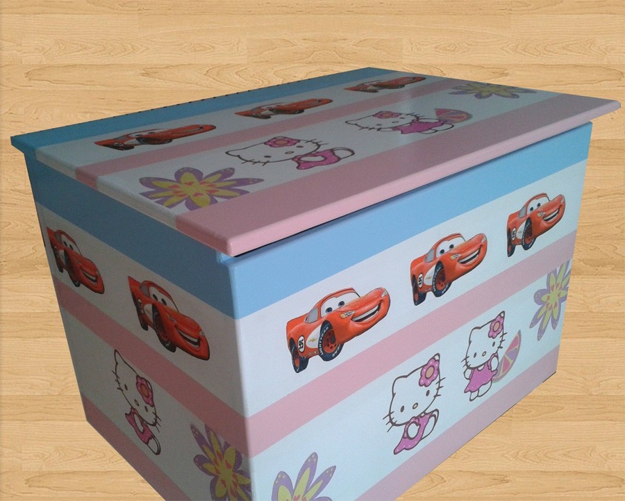 Zaboj za igrače Hello Kitty in Avtomobili (roza-modra) je unikaten zaboj za shranjevanje igrač, narejen s servietno tehniko z dvojnim motivom priljubljene Hello Kitty in Avtomobilov. Na voljo je nakup zaboja brez dodatkov, s pohištvenimi kolesi in/ali varovali za pokrov.