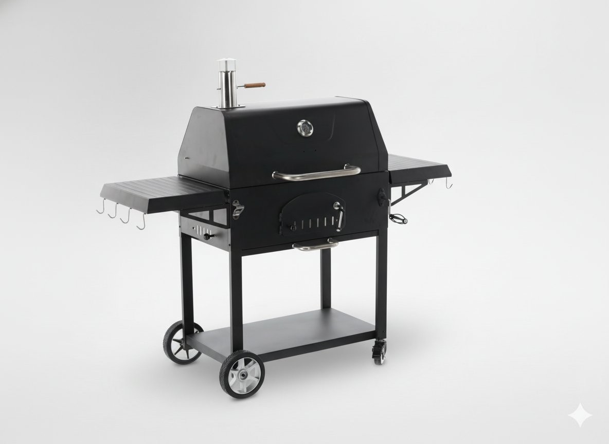 Pokrov z vgrajenim termometrom omogoča lažji nadzor temperature. Litoželezna rešetka podpira enakomernejšo porazdelitev toplote. Transportna kolesa olajšajo prestavljanje žara. Praktične police dopolnijo delovno površino.