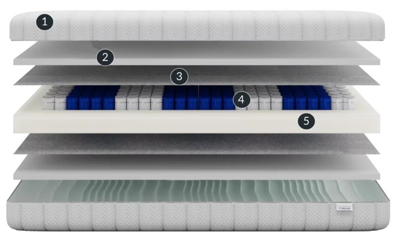 Žepkasta vzmetnica HASAN je izdelana iz kakovostnih materialov, ki zagotavljajo elastičnost, čvrstost in prilagajanje telesu. Kljub elastičnosti je vzmetnica odporna na dolgotrajno uporabo. Njena struktura nudi čvrsto oporo za hrbtenico in tako pripomore k pravilnemu položaj telesa med spancem. Narejena je iz 5 plasti med katerimi ima vsaka pomembno vlogo pri ohranjanju oblike in elastičnosti vzmetnice.