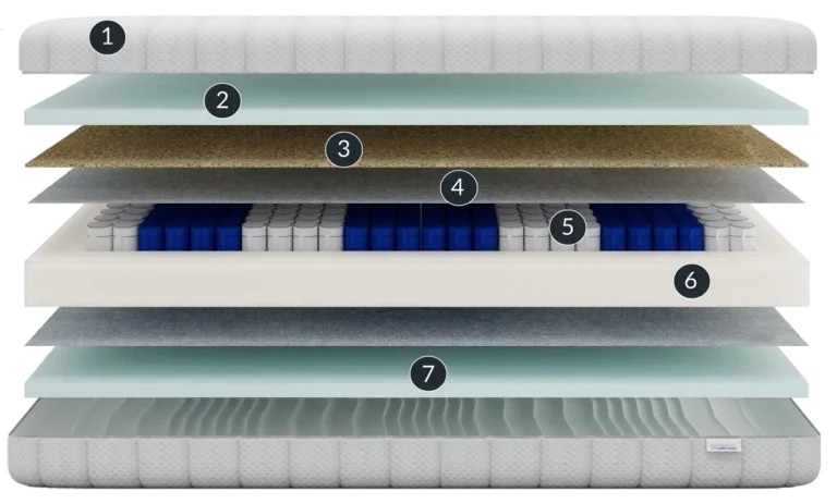 - 7-consko jedro: središče vzmetnice je iz vzmetenega jedra, ki vsebuje o 272 vzmeti/m². To poveča udobje vzmetnice in njeno prožnost. Tako omogoča dodatno oporo za težje dele telesa, kot so boki. Struktura vzmetnice s tem omogoča pravilno postavitev hrbtenice med spancem