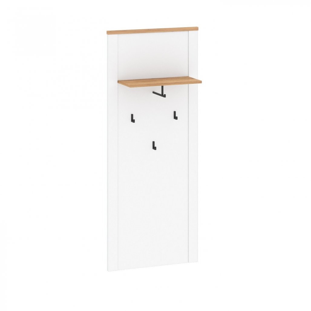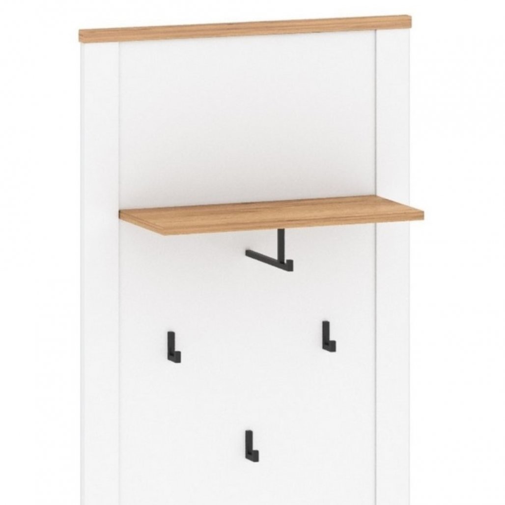 Stenski obešalnik TEOLO 5 (bela + hrast) je idealna izbira za vaš dom. S tremi robustnimi kavlji in zgornjo polico nudi praktično rešitev za shranjevanje oblačil in dodatkov.