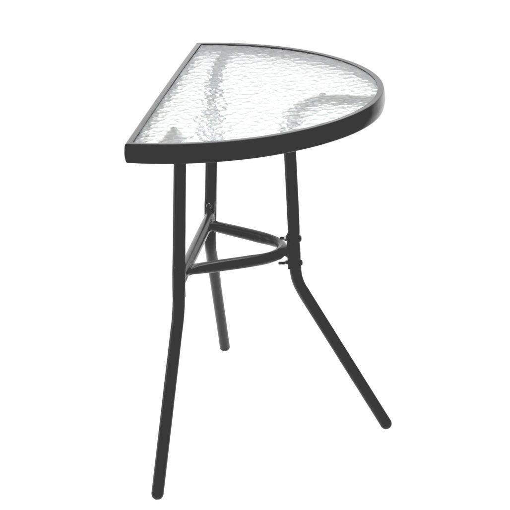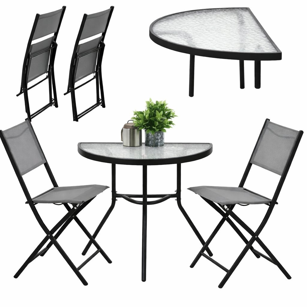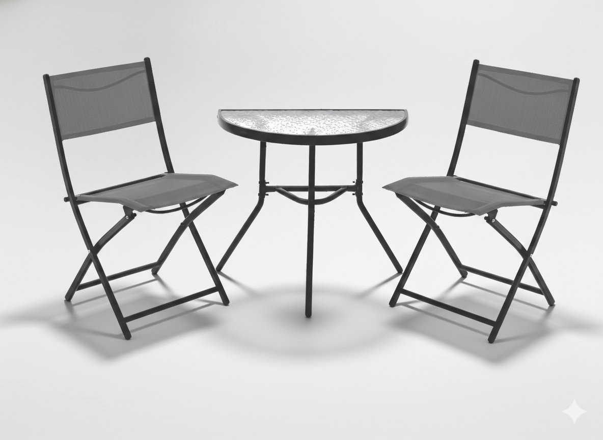 Komplet vključuje mizico in dva stola. Pri izdelavi so uporabljeni tekstil in kaljeno steklo. Dimenzije: 70x40x65 cm. Primeren je za uporabo na vrtu, terasi in balkonu.