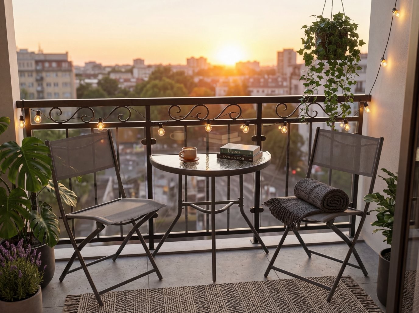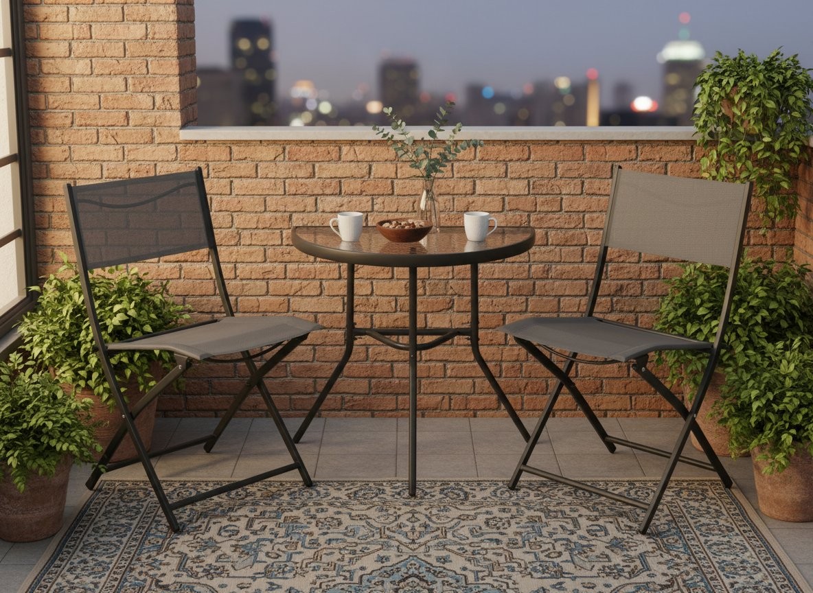 Zložljiv balkonski set Matic (mizica + 2 stola, siva) je zasnovan za urejen in praktičen balkon ali manjšo teraso. Barvna izvedba je siva.